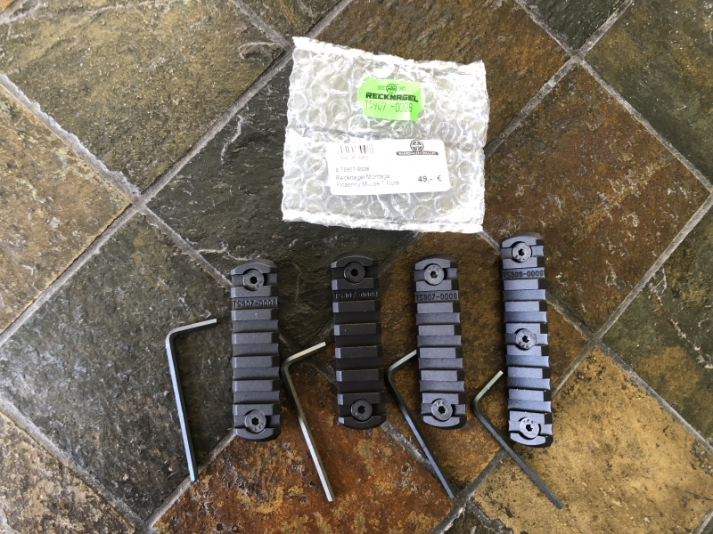 4 Stück Recknagel Montagen/Picatinny M-Lok; 3 St. mit 7 Nuten u. eine mit 8 Nuten.