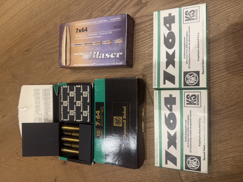 100 Schuss 7x64. Davon 40 Patronen RWS, TIG 10,5 g, in zwei Packungen, eine noch versiegelt. Weitere 40 Schuss Kegelspitz 8,0 g, beide Verpackungen noch versiegelt. Eine Packung (20 Schuss), Blaser CDP-Geschoss 10,0 g. Versand leider so teuer, weil mit Overnight. Sonst gerne Abholung.