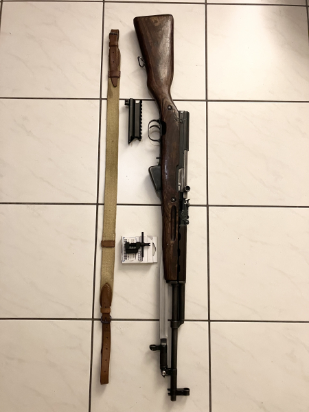 Guten Tag, ich verkaufe hier meinen Nummerngleichen Simonov SKS im Kaliber 7,62x39. Das Gewehr befindet sich in einem dem Alter entsprechend guten Zustand. Das Bajonett ist per Bolzen( Baumarkt ) gesichert und kann vor dem sportlichen schießen einfach abmontieren werden. Die Lauf ist Blank und Felder/Züge scharf. Es sind auch noch Justierwerkzeug sowie Trageriemen und Montage für ZF oder Rotpunkt mit dabei. Alles in allem einfach ein tolles Gewehr zum Schießen.
