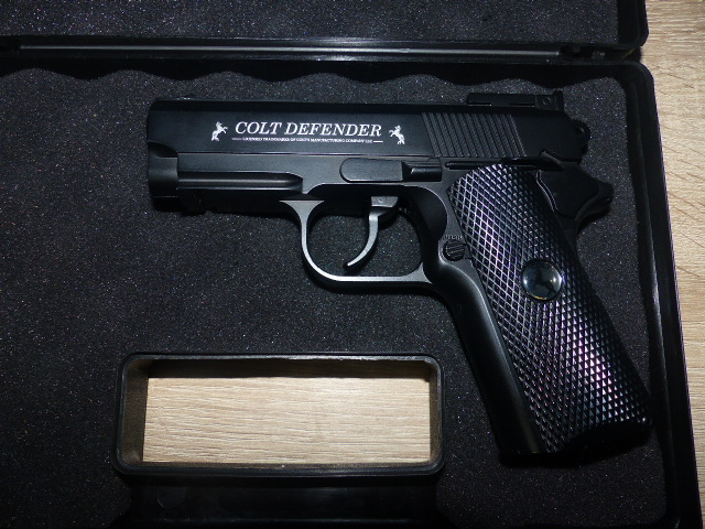 Vollmetall mit Kunststoffgriffschalen, 16 Kugeln 4,5 mm BB Magazin integriert. Die original Schachtel habe ich nicht mehr aber dafür kommt die Colt in einem gepolsterten Kunststoffkoffer.