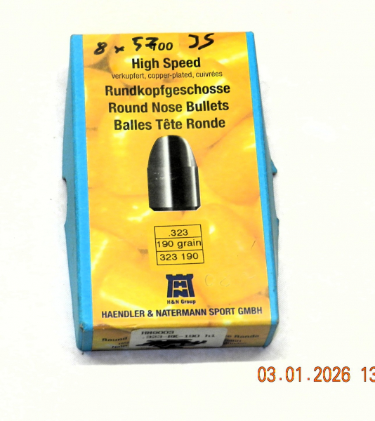 Hier biete ich an :1 Schachtel mit 80 neuen Geschossen der Firma Haendler und Nattermann im Kaliber 8x57 IS zum Wiederladen.. Es sind dick verkupferte Bleigeschosse für reduzierte Ladungen zum Scheibenschießen. H+N bietet Ladedaten an.