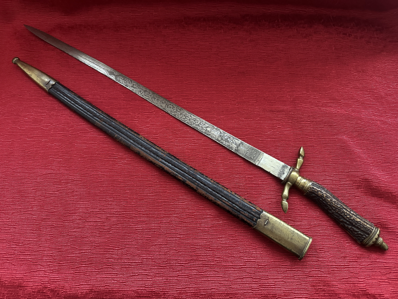 Aus großer Sammlung dieses Exemplar voller Geschichte mit echtem Horngriff und Lederscheide.Länge 61cm, Zahl 28 eingeschlagen an der Innenseite der Parierstange und Ring.Geht nicht ganz in die Scheide,Ca.1.5 cm.Die Bilder als Beschreibung beachten.Von privat ab 1€ ohne Rücknahme.EU-Ausland Versandkosten 25€.