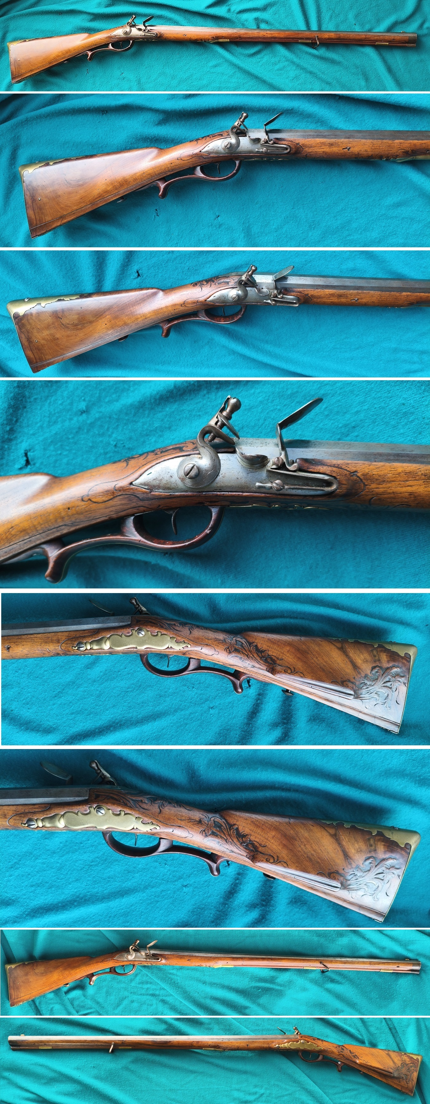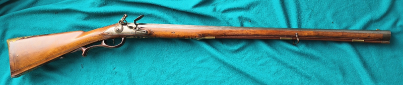 Achtkantiger Lauf, Kal. ca. 14,5mm glatt. Sternförmig eingelegtes Korn. Steinschloß mit zwei Rasten, gute Funktion. Nussholzganzschaft (in der Gebrauchszeit lang aufgeschuht). Gesägte Messingbeschläge. Abzugsbügel Holz mit Messingband (Kapuzinerschäftung für die winterliche Jagd). Schaft mit Hornabschluß und Ladestock mit Horndopper. Gesamtlänge 120cm (Versand per Paket mit Service Sperrgut).