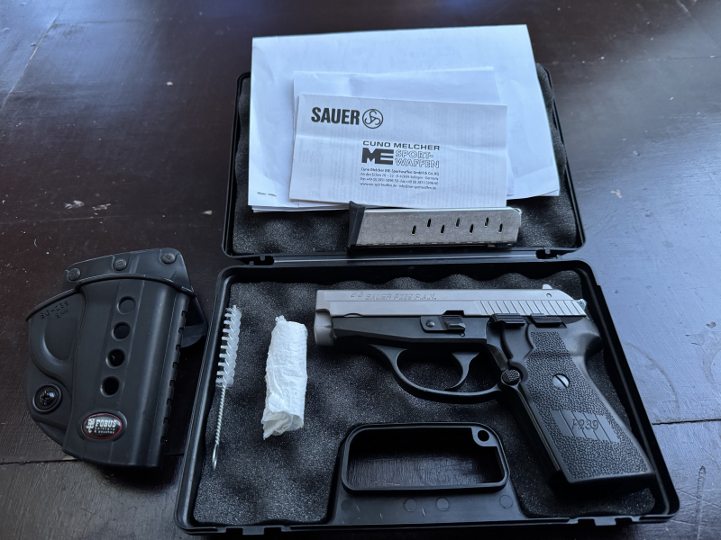 Biete hier meine robuste Sig Sauer P239 in Titan, mit einem Magazin, Fobus Hartschalenholster, Reinigungsstab und Abschussbecher.