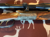 Hahnkipplaufbüchse, Kaliber 8x57IS, Hahn-Seitenschloss mit gegenüberliegender Platte, Greener Querriegel, Baujahr 1925 laut Vorbesitzer, Round Body - beste Verarbeitung, Tief gestochene plastische Jagstück-Gravuren, rechts Altier und Hirsch, linke Keiler und Bache, feine Skroll-Gravur, tief gestochene Umrandung. Besonderheit: verlängerte Scheibe Skroll-Gravur, fein gravierter Abzugsbügel mit Monogramm-Platte (noch offen). Alle Halteschrauben feine Skroll-Gravur, Öffnungshebel (Top-Opener) leichte Gravur auf dem Rücken, Laufwurzel leichte Gravur mit Goldeinlage. Feine Randgravur auf Patentschnäpper am abnehmbaren Vorderschaft, Schaftmagazin Klappdeckel mit Skroll-Gravur. Wurzelmaserholz, dreifache Falzbacke. Sehr fein geschnittene Fischhaut. Suhler Einhak-Montage mit leichter Gravur, Zielfernrohr Zeiss 6x42T. Handwerkliche Fertigung - Liebhaberstück.