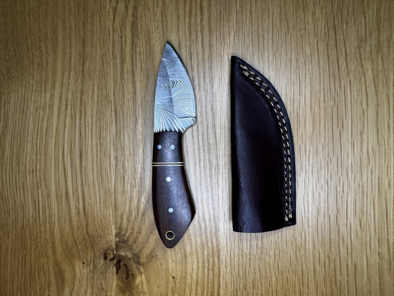Zum Verkauf steht ein handgefertigtes Messer mit markanter Damaststahl-Klinge und hochwertigem Holzgriff in klassischer, ergonomischer Form.