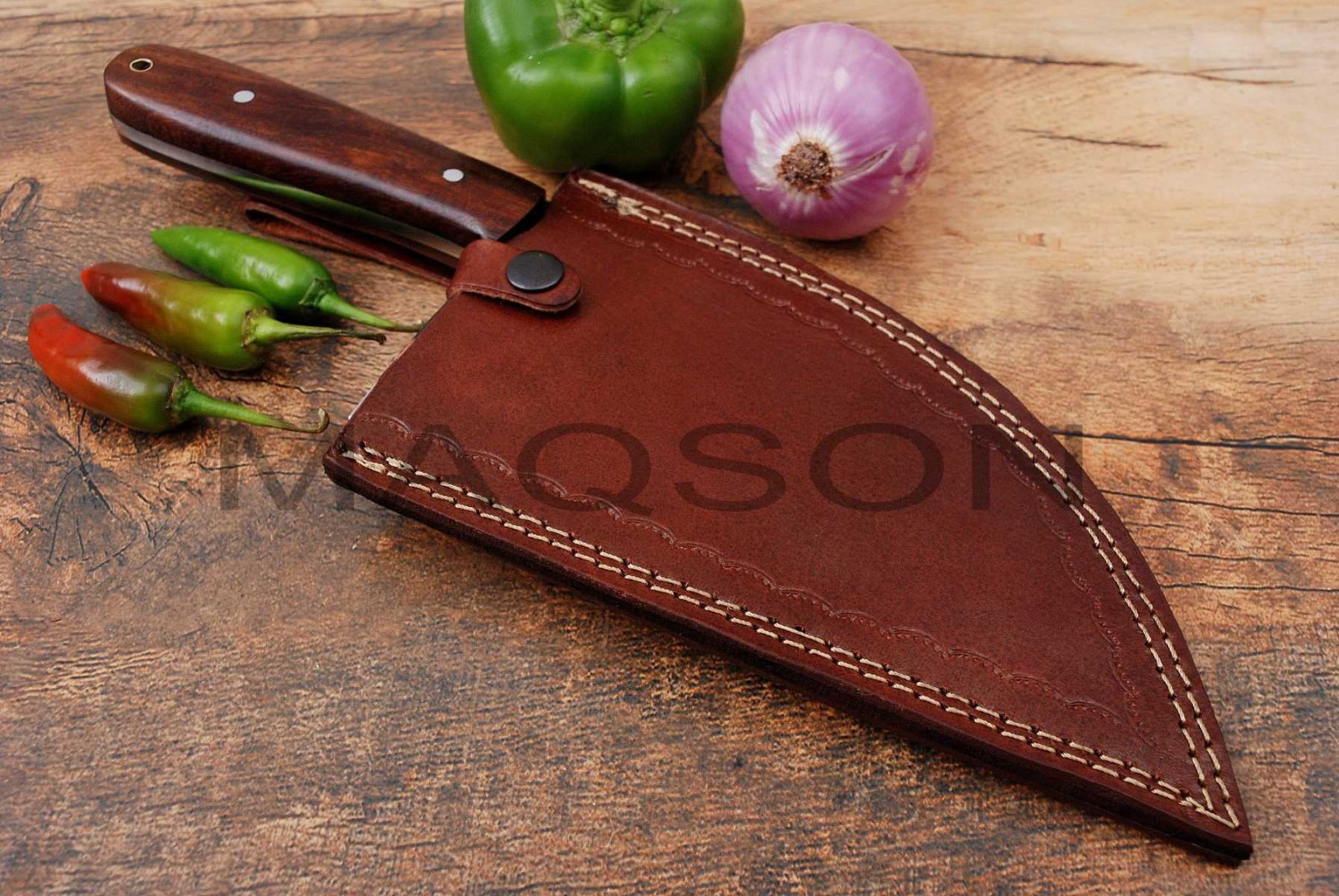Hier erhalten Sie ein hochwertig Hand geschmiedetes 1095 stahl. Küchenmesser Hack Beil Klinge. Hack Küchenmesser Klinge. Die ebenfalls Hand gefertigte Leder Scheide besteht aus hochwertigem Rind Leder und wurde dem Messer genau angepasst.