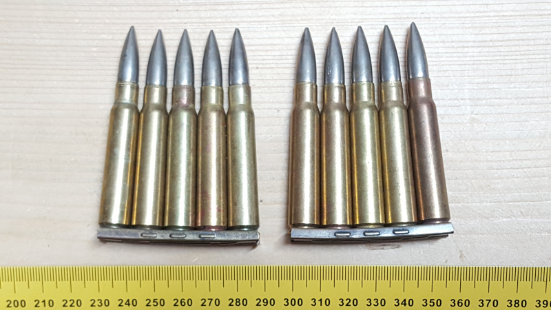 Sammlermunition: 10 Dekopatronen 7,9 mm. Deutsch 1.WK auf Ladestreifen.