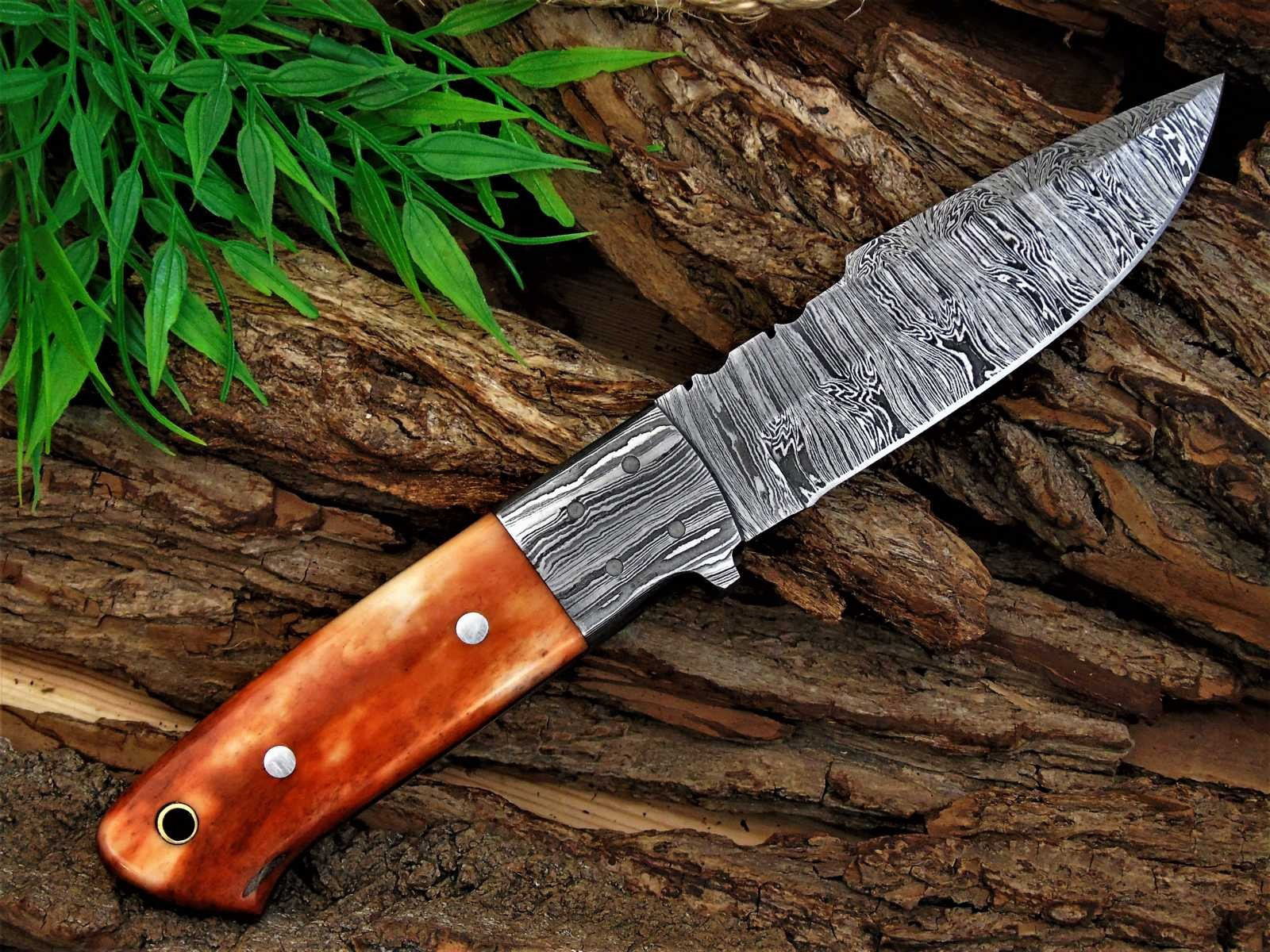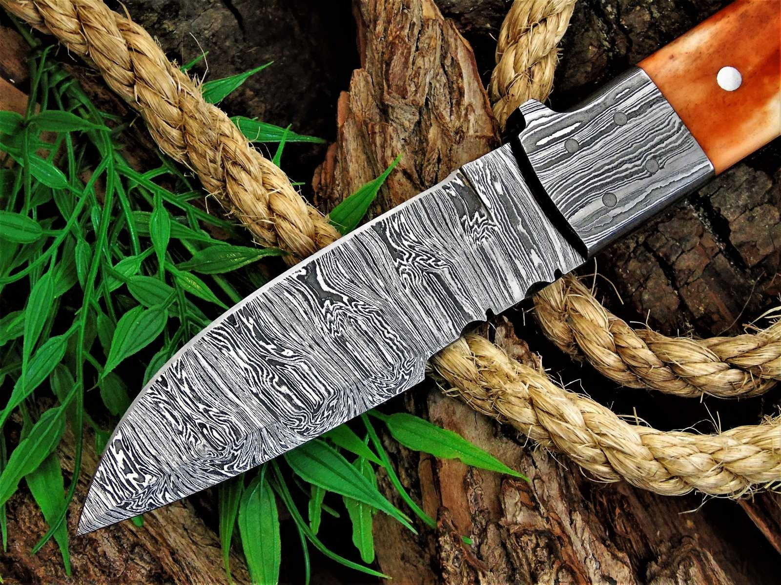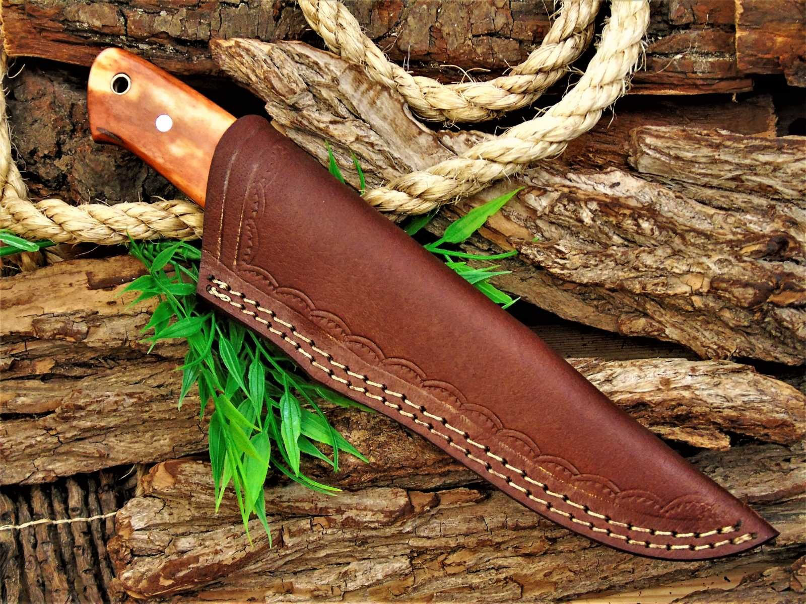 Damast Jagdmesser schöne Klingenmaserung Damast Stahl mit Lederhülle MAQ1301