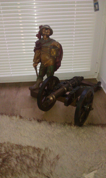 Hallo Biete hier aus meiner Sammlung eine schöne Alte Große Kanone mit Passender Geschnitzter Holzfigur an Thema 30Jähriger Krieg Kanone Länge 70cm Höhe 24 cm breite 33cm Gewicht Ca 7Kg Rohrlänge 40cm Kaliber 1,9cm Beschuss Möglich Massives Bronzerohr. Figur ist passend im Maßstab mit Sockel 53 cm ohne Sockel 47 cm Groß .Topp Dekoration und Antik .Fragen werden Gern beantwortet. Bei Sofortkauf KEINE VERSANDGEBÜHREN. Keine Garantie Gewährleistung Oder Rücknahme