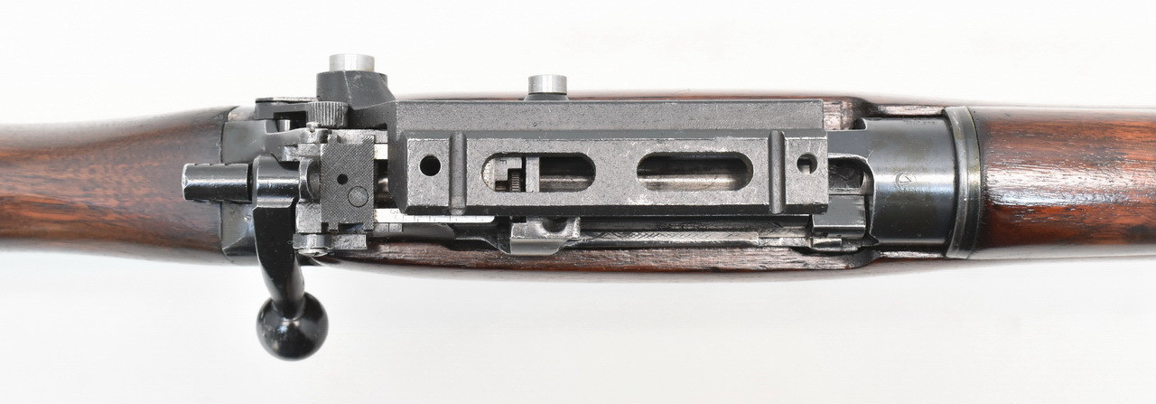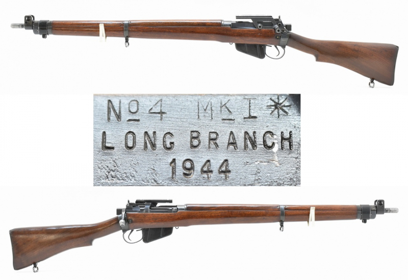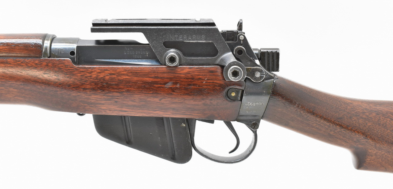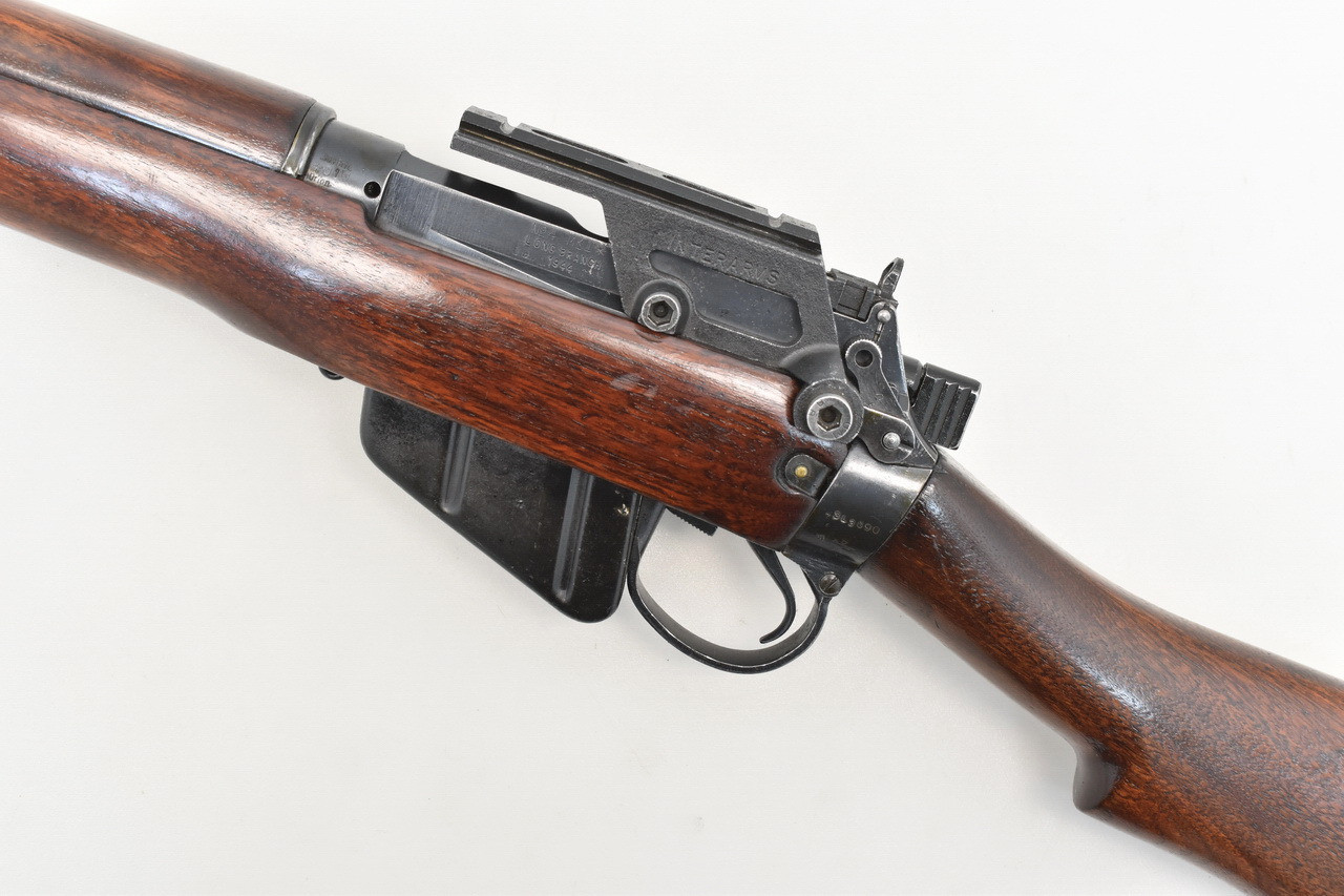 Lee - Enfield Gewehr No.4 Mark I* aus kanadischer Long Branch Fertigung des Jahres 1944. Mit MK I Dioptervisierund und später hinzugefügter Interarms ZF - Seitenmontage. Matter und rauer Originallauf. Mellrichstädter Beschuß 1989. Orion Vertriebsstempel. Systemhülse und Schäftung mit kanadischer Eigentumsmarkierung. Mit Trage- und Gebrauchsspuren einer geführten Ordonnanzwaffe. Details siehe Bilder.