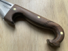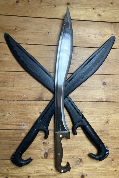 Ich biete hier die iberische Falcata (Falcata Sword) von Condor Knife & Tools an (El Salvador) an. Sehr scharf geschliffene Klinge aus 1075er Karbonstahl, Gesamtlänge ca. 64 cm, Klingenlänge ca. 49 cm, Gewicht. ca. 540 g. Fulltang-Klingenangel, Griff aus Walnussholz, robuste Scheide aus dickem Leder mit Gürtelschlaufe und Druckknöpfen. Dazu passend zwei Polypropylen (PP) Trainings-Falcatas für das sichere Training mit diesem Schwert. Sehr guter, neuwertiger Zustand. NP zusammen 270 Euro (Da dies ein privater Verkauf ist, gewähre ich keine Garantie und kein Rückgaberecht (siehe EU-Recht).