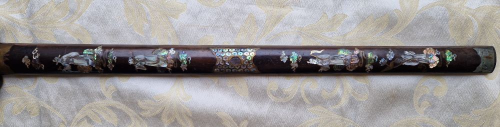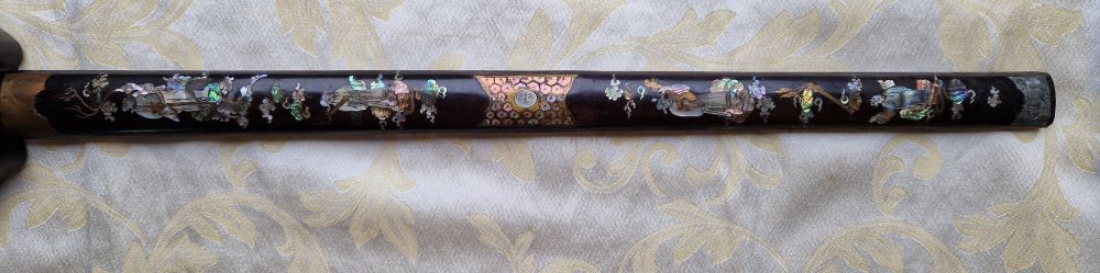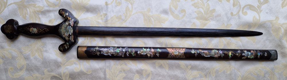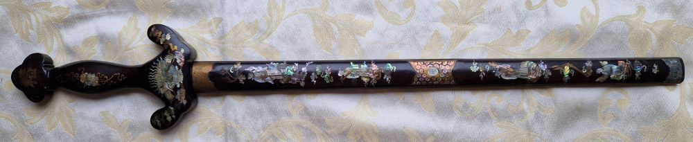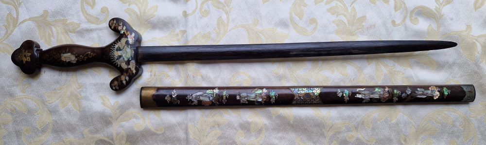Typische Holzklinge. Beidseitig fein eingelegter Griff (Perlmutt und Messing). Scheide in gleicher Manier mit figürlichen Darstellungen usw. – siehe Fotos.