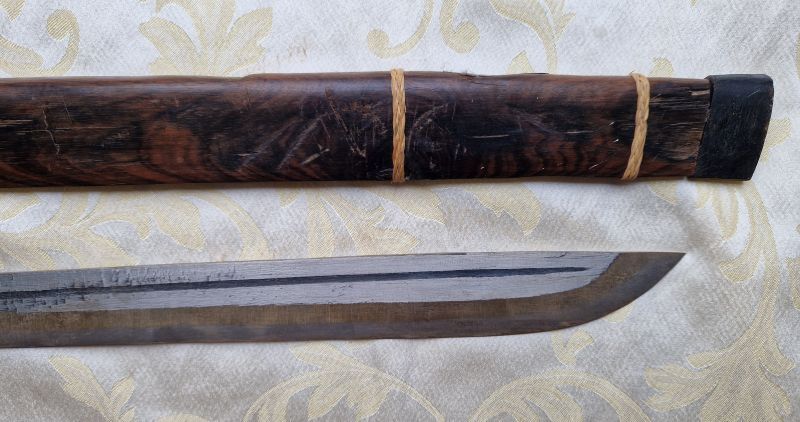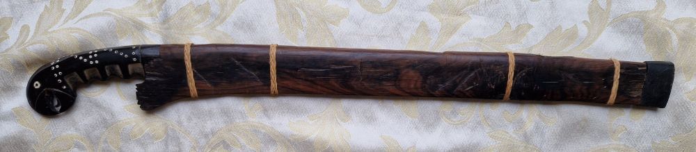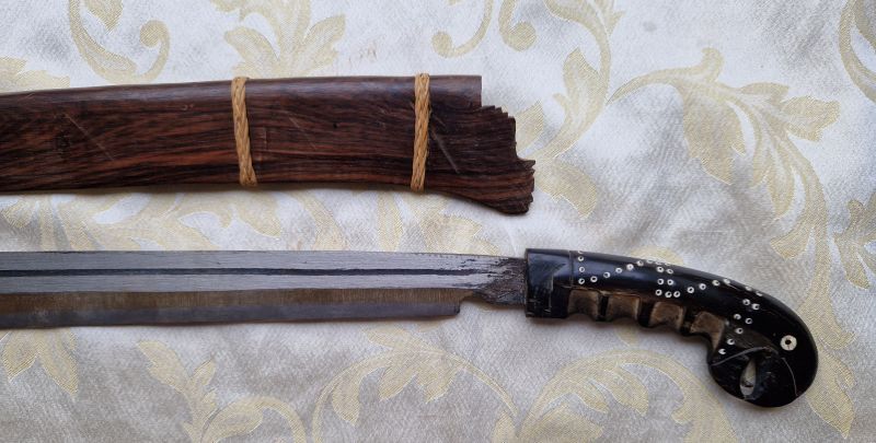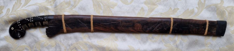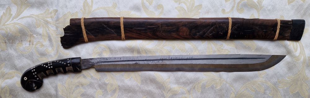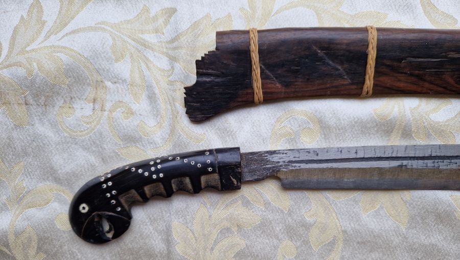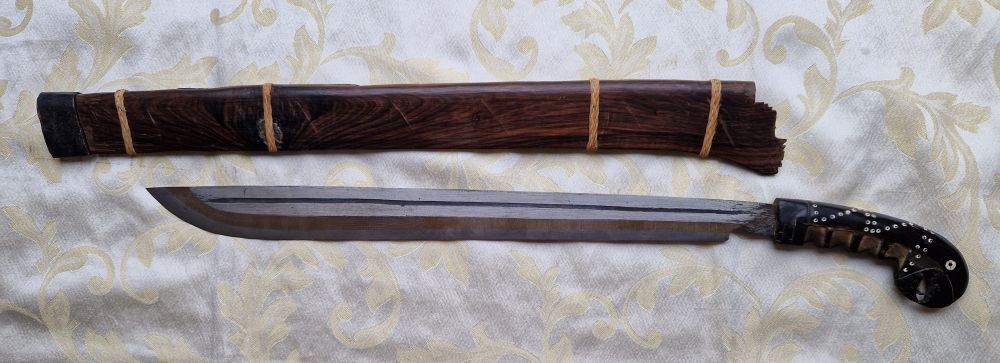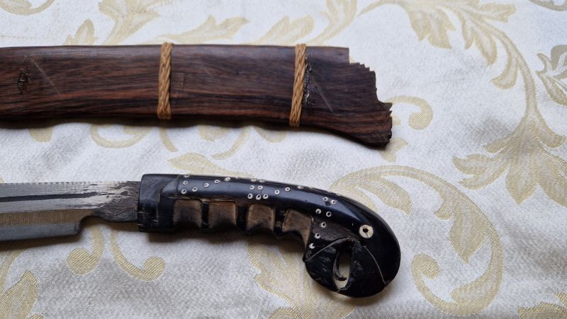 Kräftige, scharf angeschliffene Rückenklinge. Kuhhorngriff in Form eines Papageienkopfes.