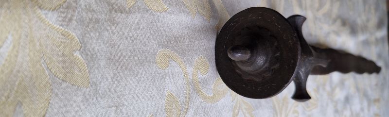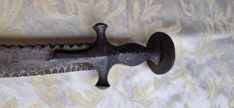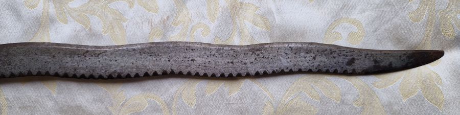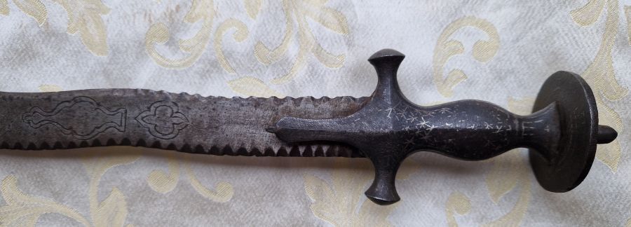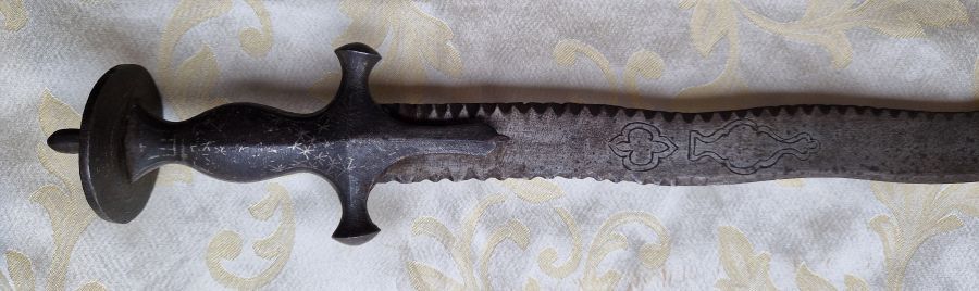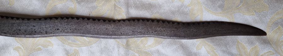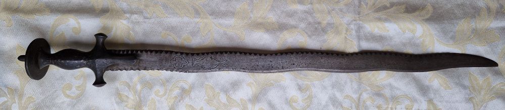 Zweischneidige, schlangenförmig gewellte Klinge. Rückseitig verziert. An der Schneide beidseitiger Kerbschnitt.