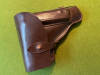 Rechtshand, Lauf geschlossen, aus stabilem dunkelbraunem Leder, mit dem typischen Verschluss von unten nach oben, der ebenfalls typischen vorderen Magazintasche und wie hier auf der Rückseite zu sehen