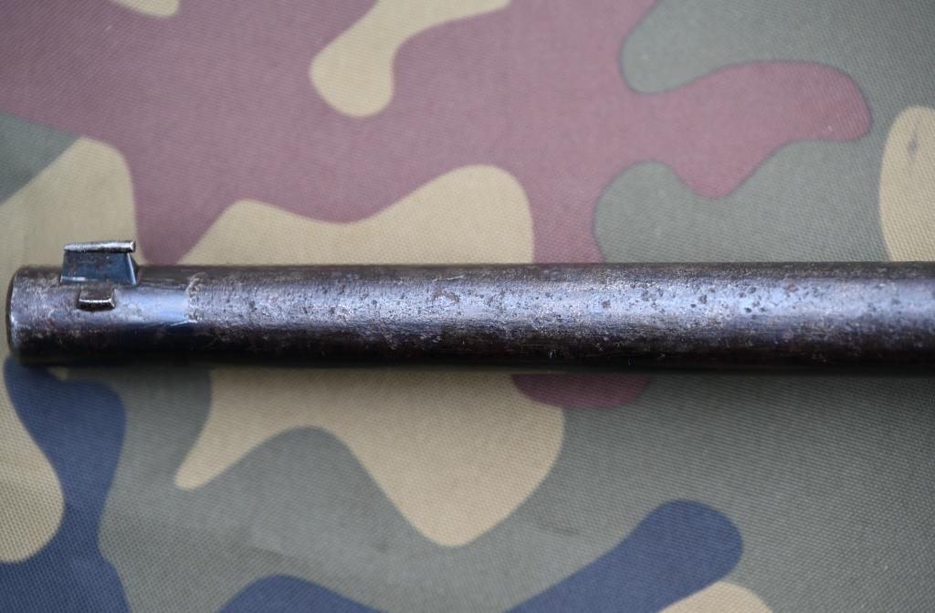 Die originale Brünierung ist über die Zeit generell gräulich-schwarz geworden, mit partiellen Rostspuren. Lauf innen dagegen sehr gut und blitzblank, mit tiefen Zügen.