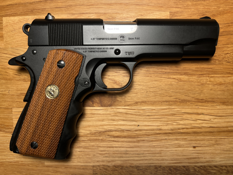 Zur Auktion steht die neue Kurzvariante des von der Fa. MWM Gillmann neu eingeführten Vollstahl-Schreckschuss-Modells der 1911 A1 der US-Army mit 4.25‘‘ Lauf mit funktionierender Handballensicherung.
