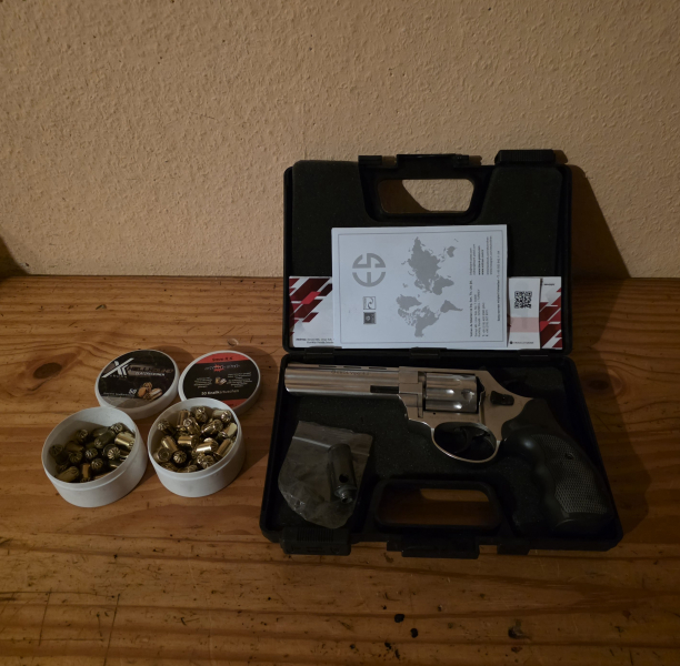 Hier biete ich den Ekol Viper 4,5 Zoll inklusive Koffer, Abschussbecher sowie 76 Schuss Munition an. Funktioniert einwandfrei wie zu sehen lediglich am Griffstück hinten etwas vermackelt aber tut der Funktion kein Abbruch. Läuft normal. 50 Schuss shoot club und 26 Schuss Hellhound sind dabei. Altersnachweiß erforderlich!