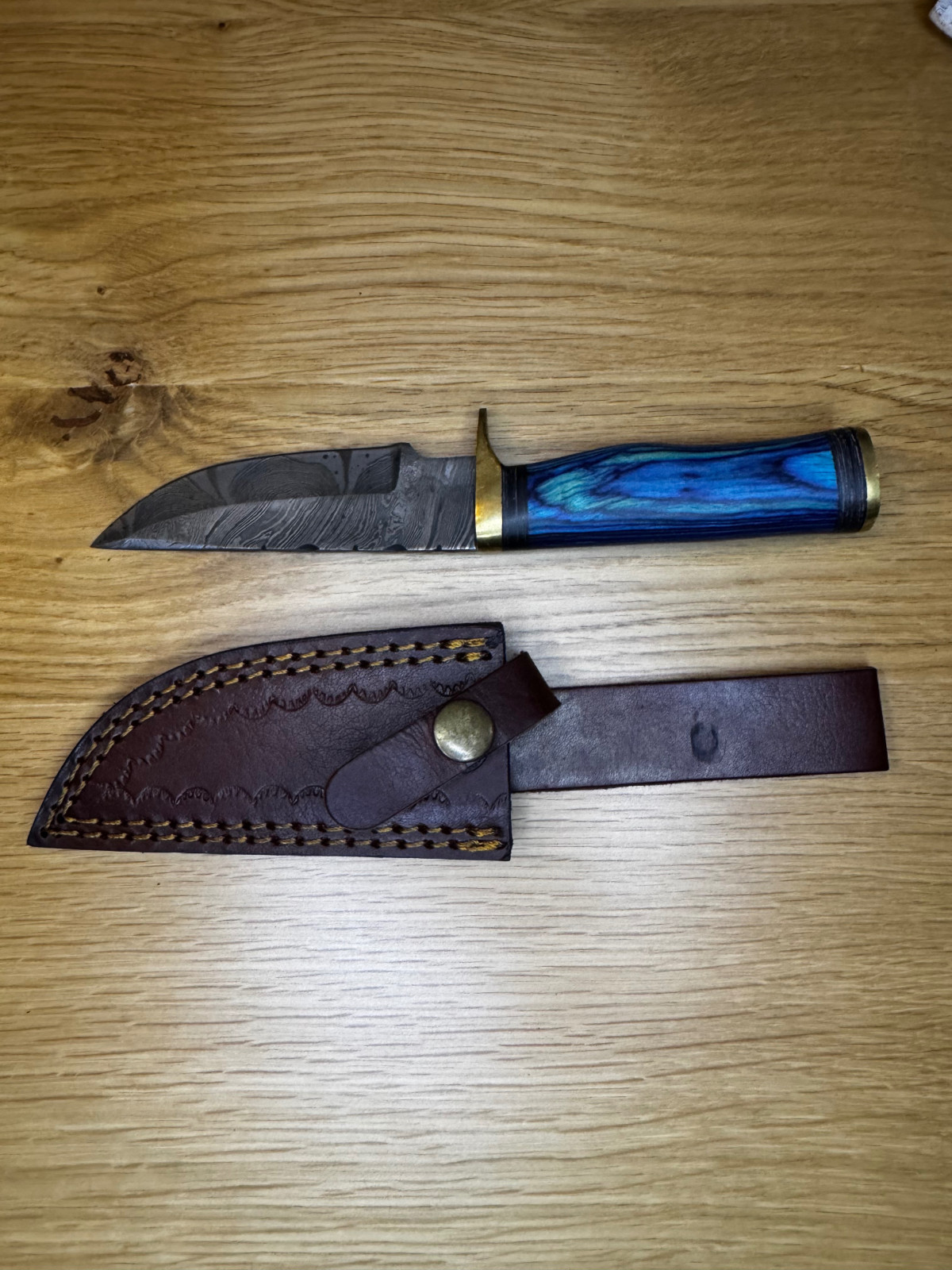 Angeboten wird ein feststehendes Messer mit Damastklinge und Lederscheide aus meiner privaten Sammlung.