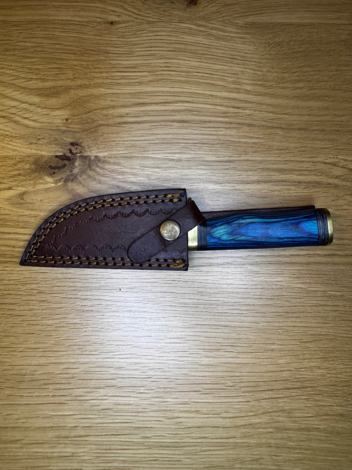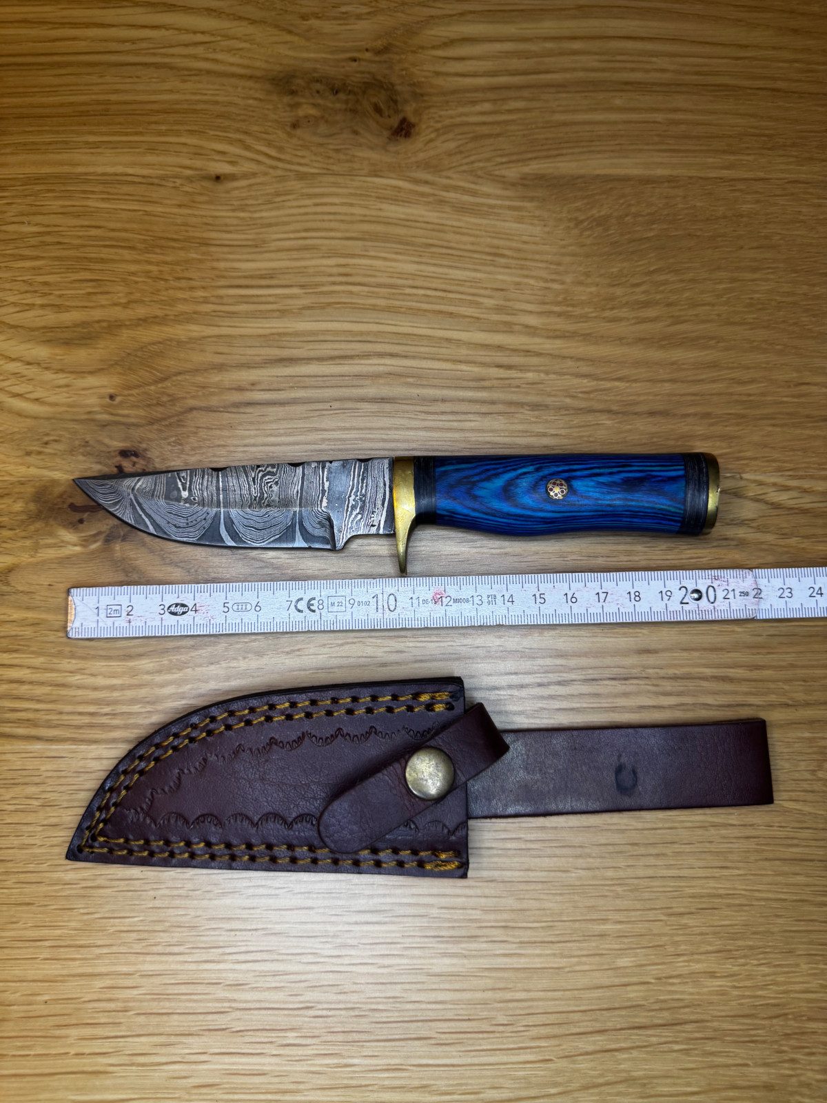 • Griff mit blau gefärbtem Holz und Messingabschluss
