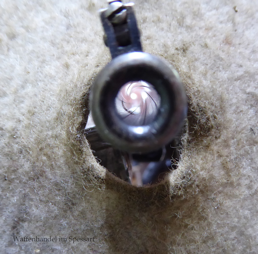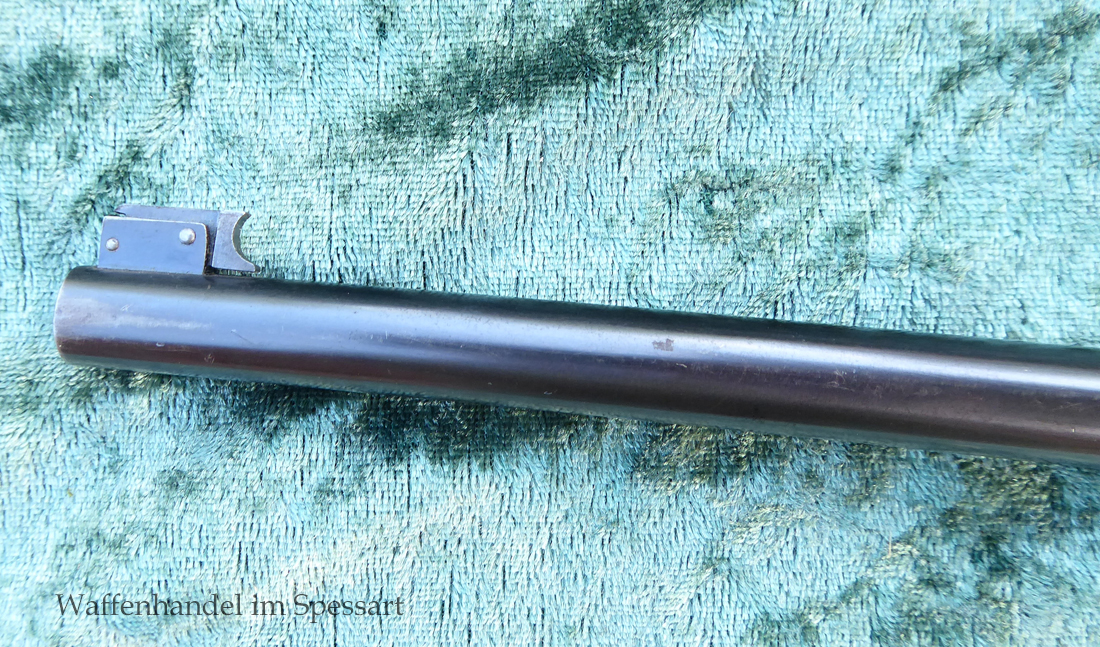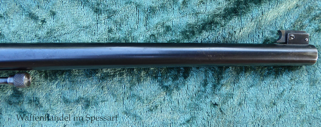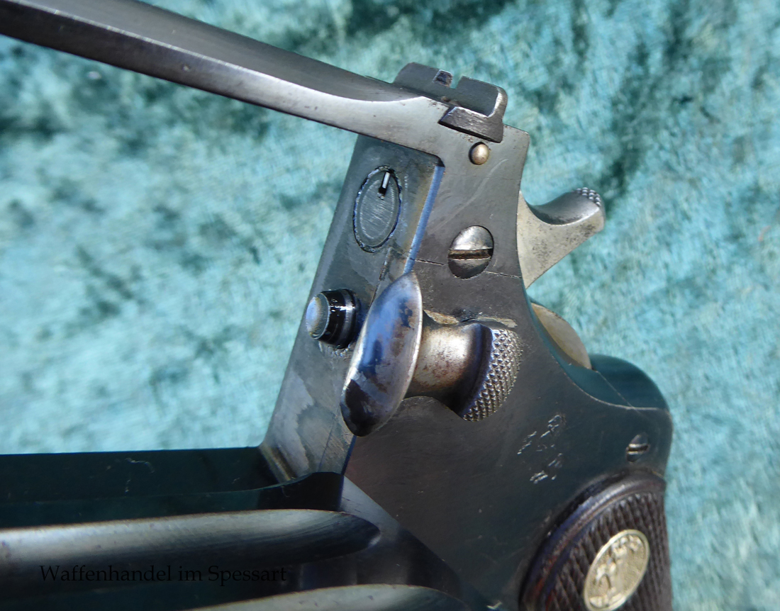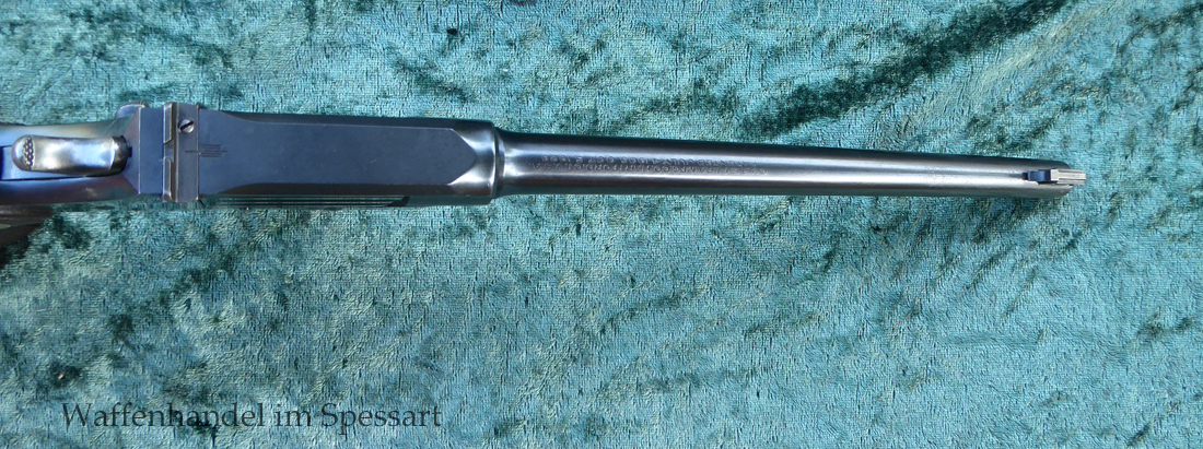 Kal..22lr. Ser.Nr. 479. Scharfkantiger fast blankes Laufinnere. Lauflänge 8" = 21cm. Sehr gute bläuliche orig. Brünierung. Bei der Firmierung auf der Laufoberseite Patente bis 1926. Baujahr 1927.