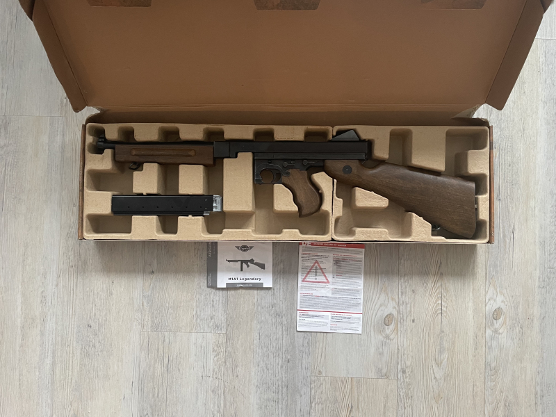 Angeboten wird ein Co2 Luftgewehr: Legends Thompson M1A1, Used Look, Blowback, 4.5mm BB. Länge ca. 805mm, Gewickt ca. 3400gr, Energie ca. 3 Joule, Geschossgeschwindighkeit ca. 135 m/s, Pistolengriff und Schaft sind aus hochwertigem Kunststoff in Holzoptik der Rest ist aus Metall. Das 30 Schuss Magazin verliert etwas Gas, man kann aber mit einer Befüllung ca. 90 Schuss abgeben nur lässt sich es nicht länger befüllt lagern. Daher der niedrige Preis (Neupreis ca. 300€). Ersatzmagazine sind im Fachhandel erhältlich. Es handelt sich um einen Privatverkauf Mängelgewährleistungs- und Rückgaberechte sind ausgeschlossen. Ggf anfallende PayPal Gebühren sind vom Käufer zu tragen. Fragen werden gerne beantwortet, weitere Fotos können zugeschickt werden.