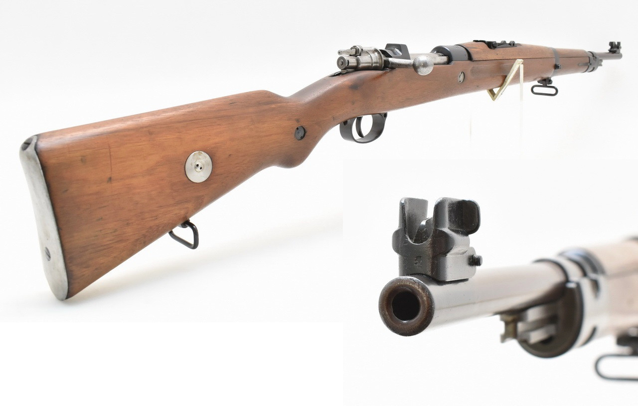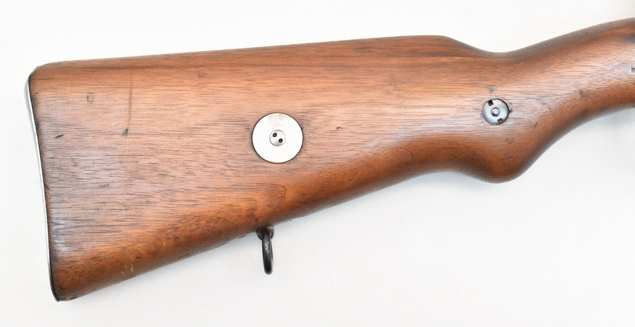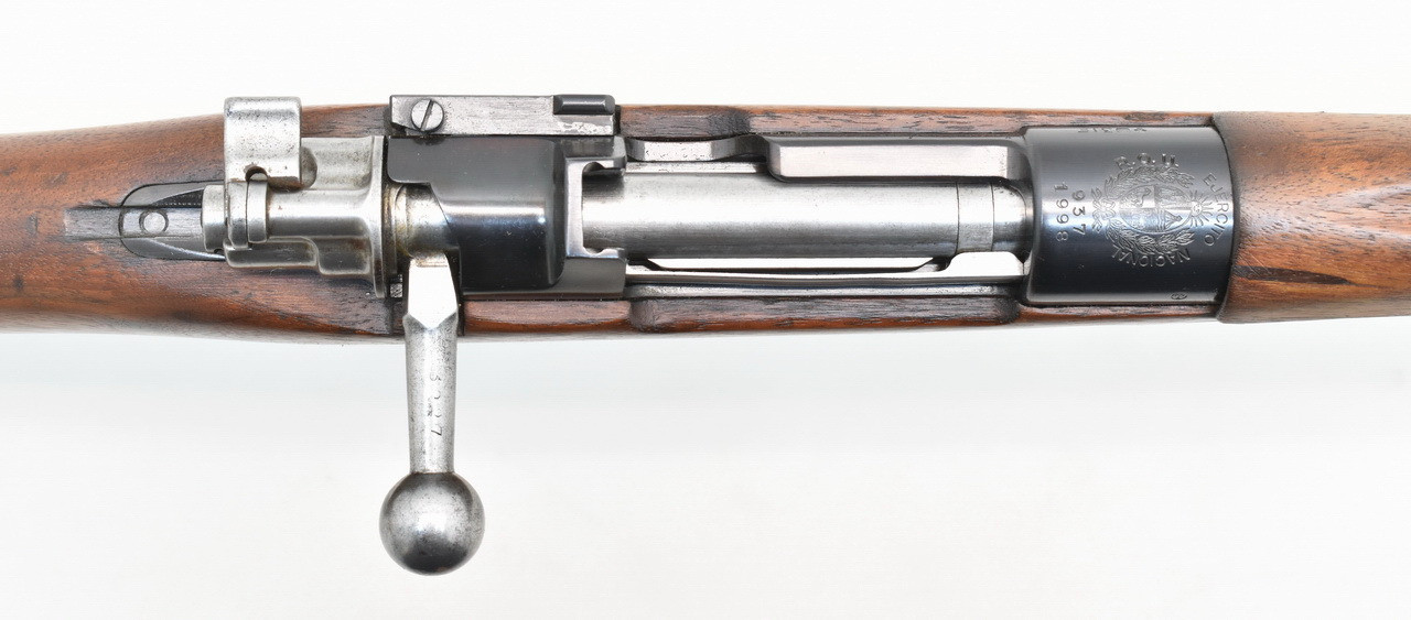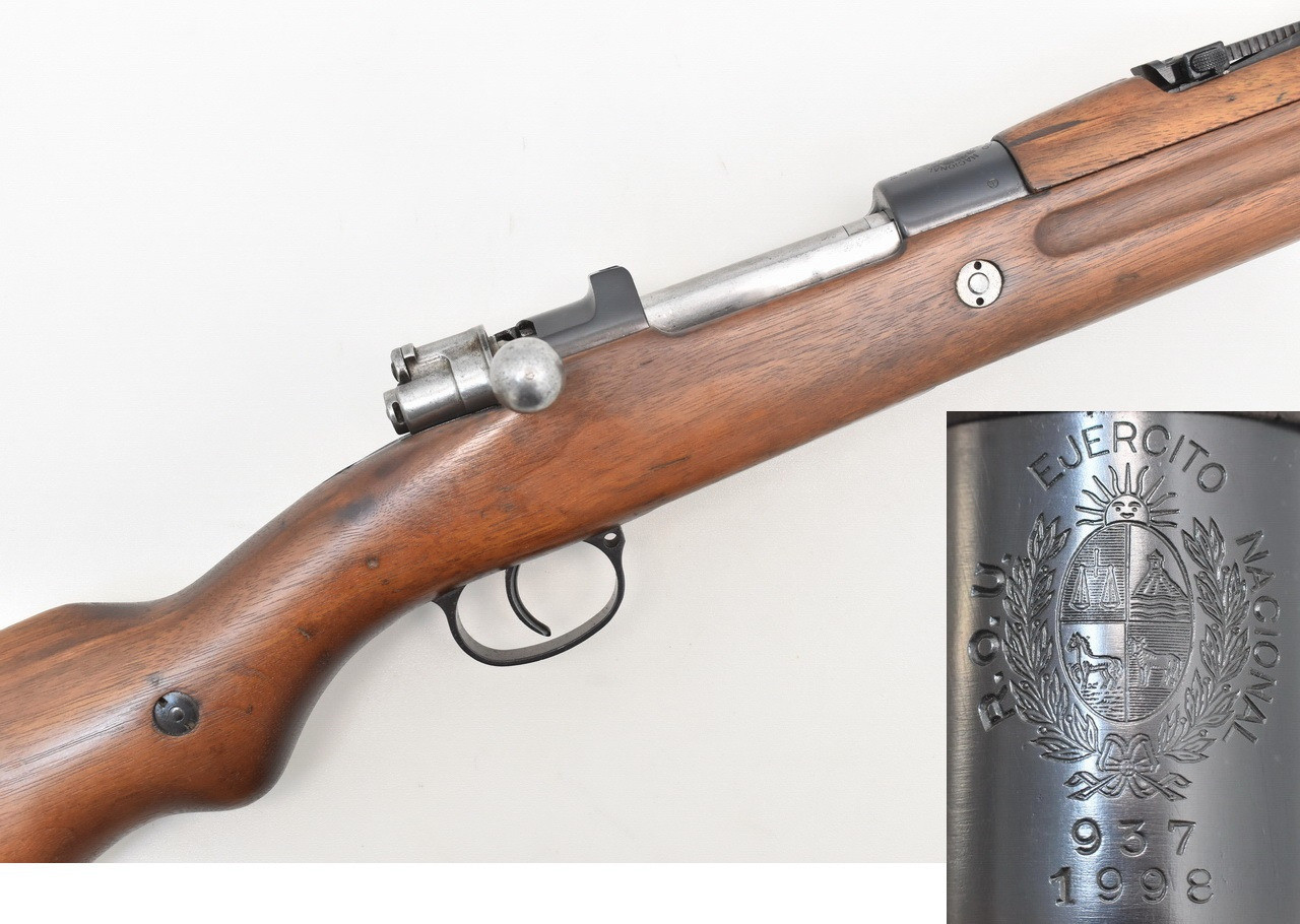 Militärgewehr mit bewährtem 98´er Mauser System aus Produktion der CZ / Ceskoslovenska Zbrojovka A.S. Brno. Der Hülsenkopf mit Staatswappen und Bezeichnung R.O.U. Ejercito Nacional 937 / Republica Oriental de Uruguay. Fertigungsjahr 1937. Unter der Modellbezeichnung " Mod. 1934 " lieferte die CZ den tschechischen VZ 32 Karabiner in einer nur 6000 Stück umfassenden Lieferung nach Uruguay. Leicht matter Originallauf. Mellrichstädter Beschuß 1985. Frankonia Vertriebsstempel. Putzstock fehlt. Leichte Trage-, Gebrauchs- und Lagerungsspuren sind vorhanden. Details siehe Bilder.