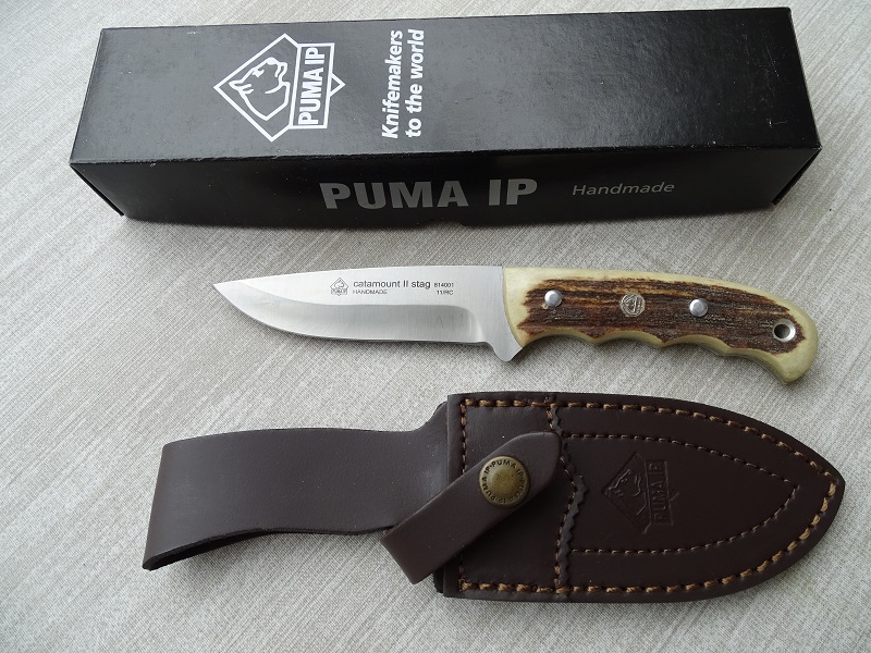 Puma Messer IP catamount 2 814001 in Handarbeit, minimale Lagerspuren, unbenützt und nicht nachgeschliffen. Ein sehr hantliches Messer für den Jagdgebrauch. Klingenlänge 112 mm, Stärke 3 mm, Stahl 1.4125--57-60 HRC, Gesamtlänge 222 mm, Beschalung Hirschhorn, Scheide in Sattelleder in original Puma -Karton. Fagen per e-mail, keine Garantie und Rücknahme.