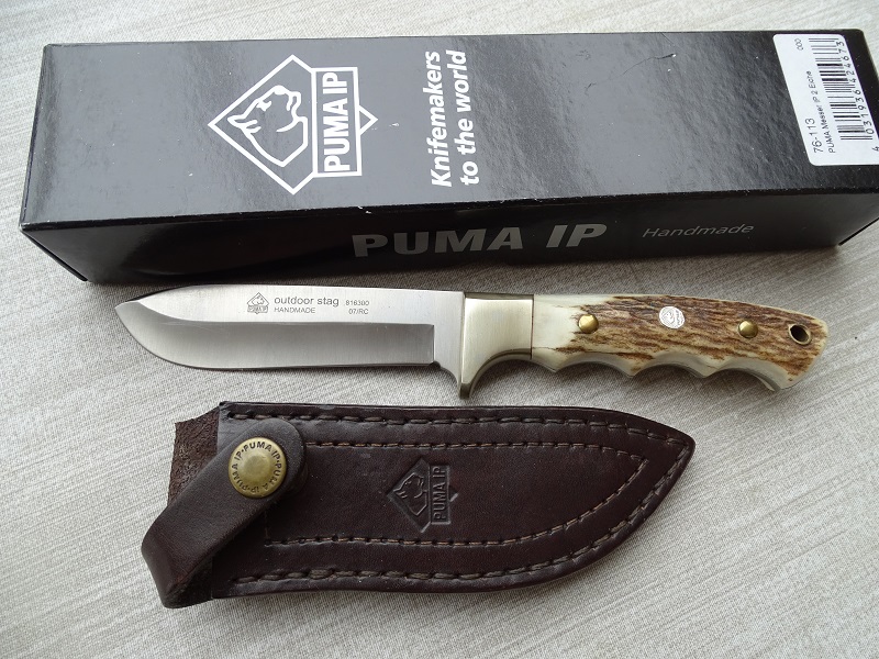 Puma Messer IP outdoor stag 816300 in Handarbeit. Ein sehr hantliches Messer für alle Revierarbeiten, Klingenlänge 117 mm, Stärke 4 mm, Stahl 1.4125--57-60 HRC, Backen in Messing, Beschalung in Hirschhorn, Scheide in Sattelleder. Minimale Lagerspuren und nicht nachgeschliffen in einem Puma Karton. Fagen per-email, keine Garantie und Rücknahme.