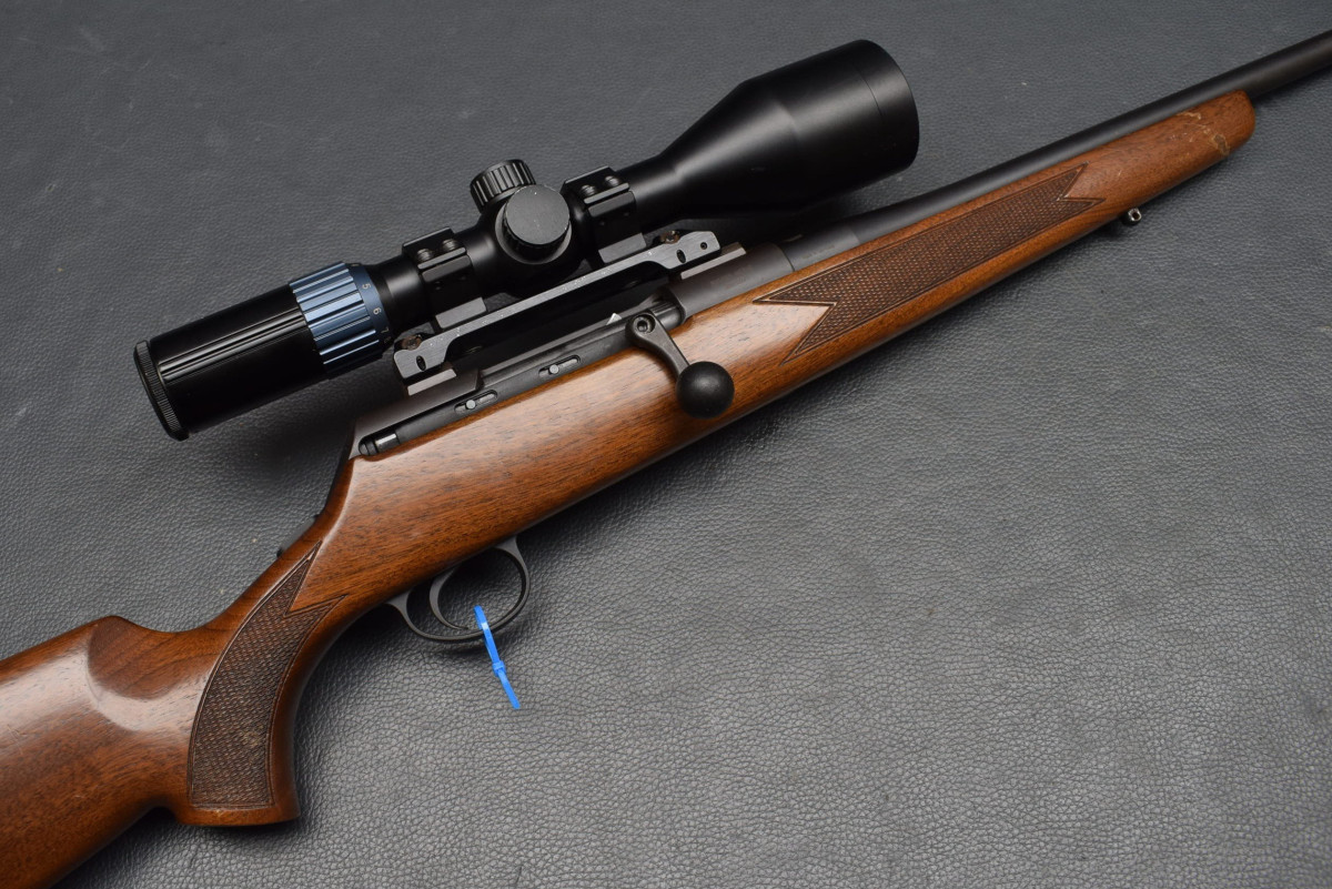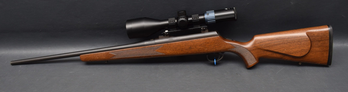 mittels Mauser Montag mit 30mm Ringen.. Nußbaumschaft mit Backe, Gummischaftkappe und Riemenbügelbasen.