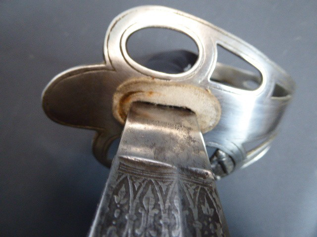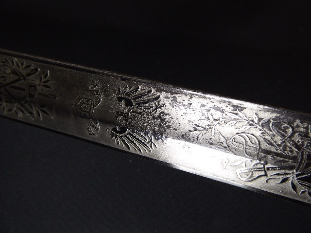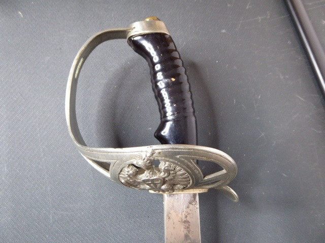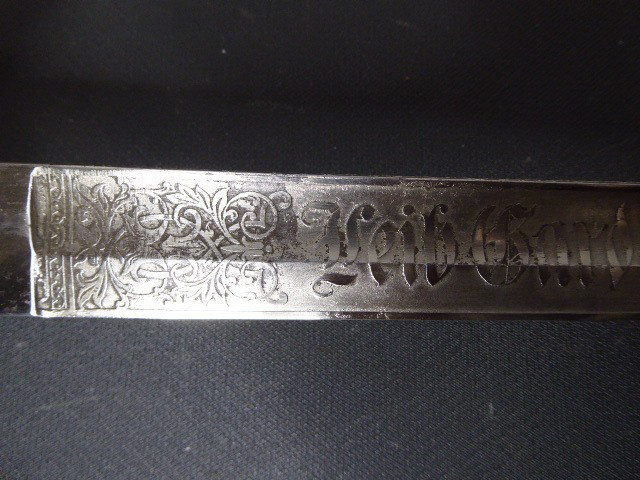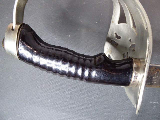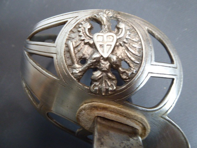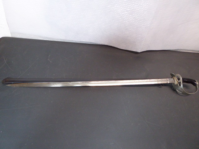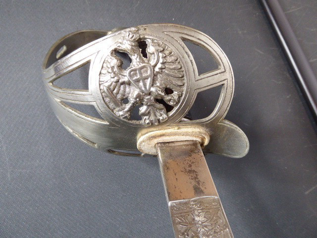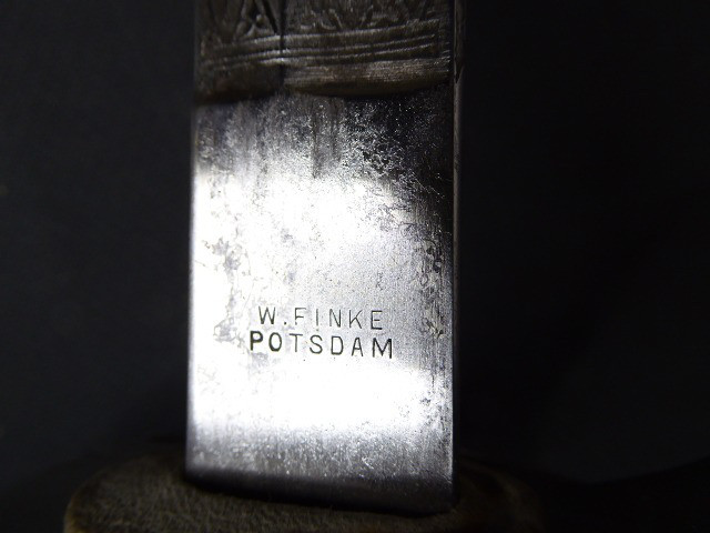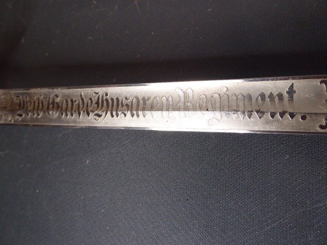 Aus meiner Sammlung gebe ich, einen alten langen Preußischen KD 89 mit Scheide LEIBGARDE HUSAREN REGIMENT mit Hersteller ab. Griff Holz mit Bakelit ummantelt, Bakelit mit Abplatzung. Großes Gefäß nicht ab klappbar aus Alpaka mit durchbrochenen Preußen Adler. Breite lange Klinge beidseitig mit Kehlungen und Hochätzungen, eine Seite LEIBGARDE HUSAREN REGIMENT mit Ornamenten, andere Seite mit Preußen Adler unter Krone und Militärischen Ornamenten. Auf der Fehlschärfe Hersteller W. FINKE POTSDAM. Das Teil ist im Guten Sammelwürdigen Zustand. Alles andere entnehmen Sie Bitte den Fotos. Gesamtlänge: 102, cm, ohne Scheide: 97,5 cm, Klingenlänge: 83,7 cm, Klingenbreite: 2,6 cm. Kann zu jederzeit bei mir besichtigt werden. Privatauktion keine Rücknahme und Garantie.