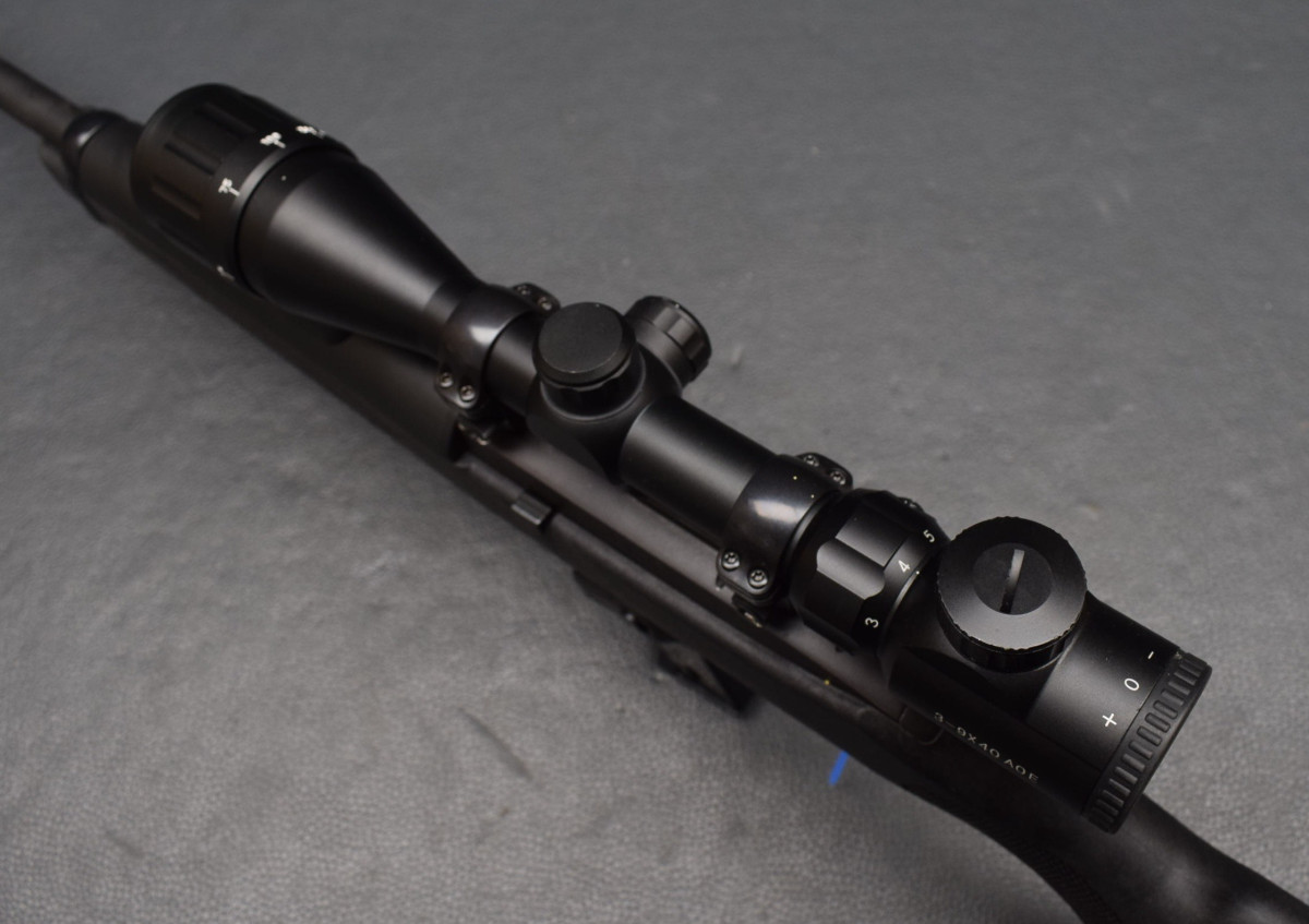 Druckpunktabzug, Sicherung am Abzugsbügel, herausnehmbares 15-Schuss Magazin. Montiert mit Zielfernrohr 3-9x40 AOe Abs. Leuchtkreuz rot/grün, mittels einer Ruger Aufkippmontage mit 25,4mm Ringen.