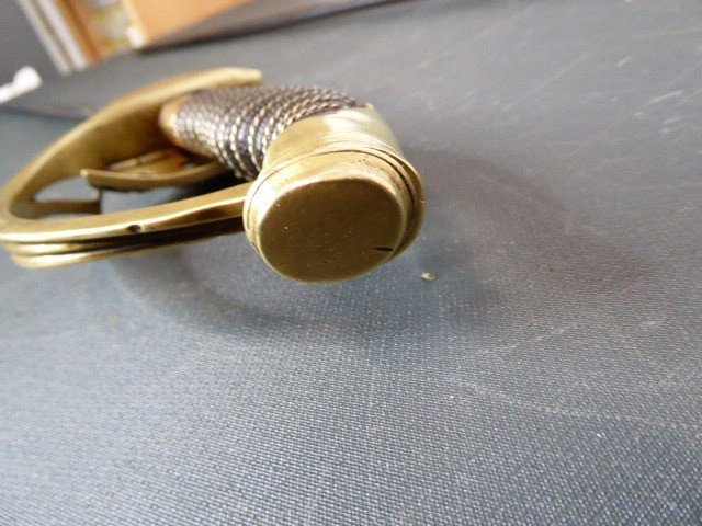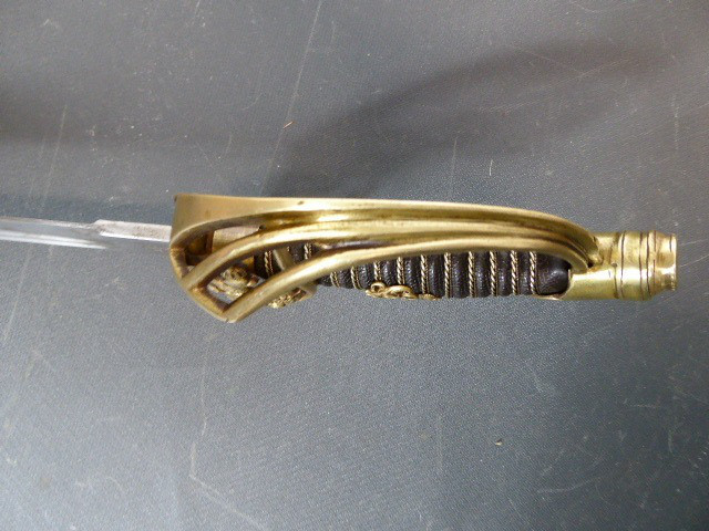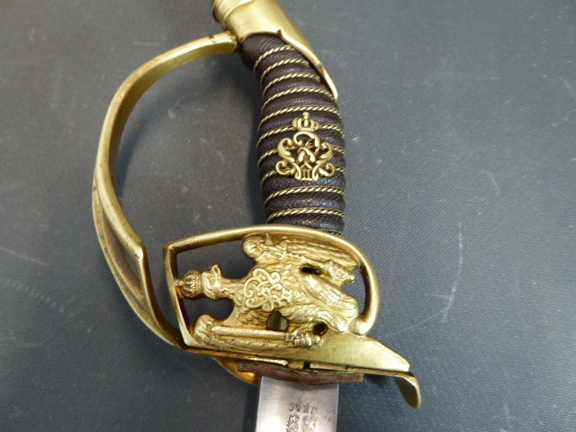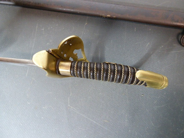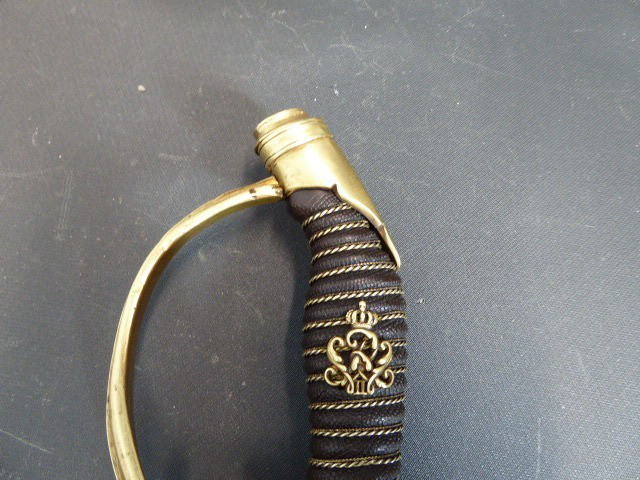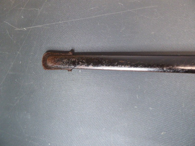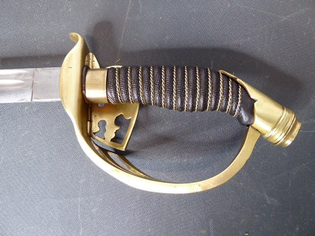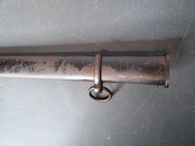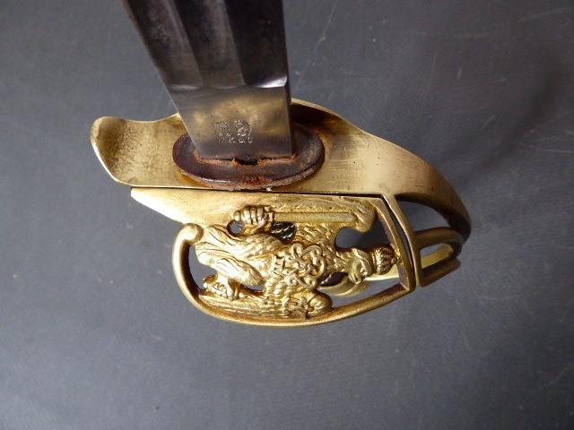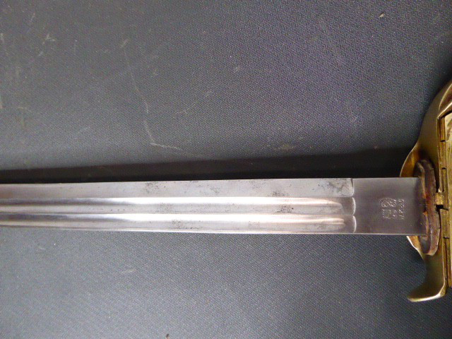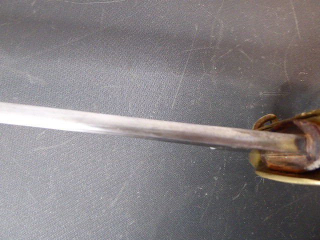 Aus meiner Sammlung gebe ich, einen alten Preußischen Extra IOD 89 mit Scheide und Hersteller W.K.& C. ab. Griff Holz mit schwarzer Fischhaut ummantelt und Messingdraht Wicklung, eine Seite mit aufgelegten Initialen FRW unter Krone. Gefäß ab klappbar Messing mit durchbrochenen Preußen Adler. Breite lange Klinge beidseitig mit zwei Kehlungen. Auf der Fehlschärfe Hersteller W.K.& C. Scheide Stahl mit ca. 65 % originalem Lack. Das Teil ist im Guten Sammelwürdigen Zustand. Alles andere entnehmen Sie Bitte den Fotos. Gesamtlänge: 97,5 cm, ohne Scheide: 95,5 cm, Klingenlänge: 81 cm, Klingenbreite: 2,5 cm. Kann zu jederzeit bei mir besichtigt werden. Privatauktion keine Rücknahme und Garantie.