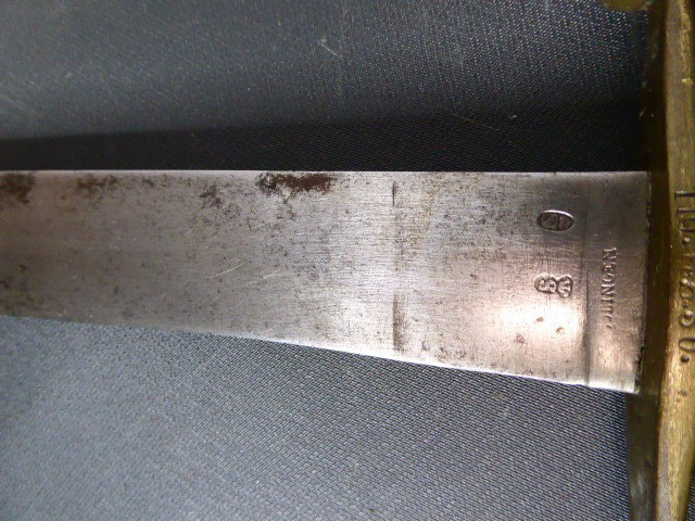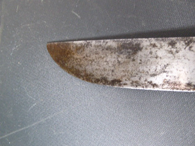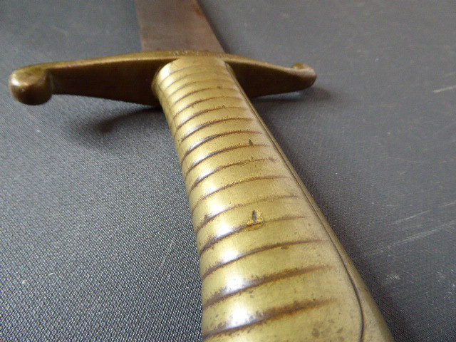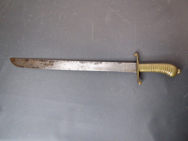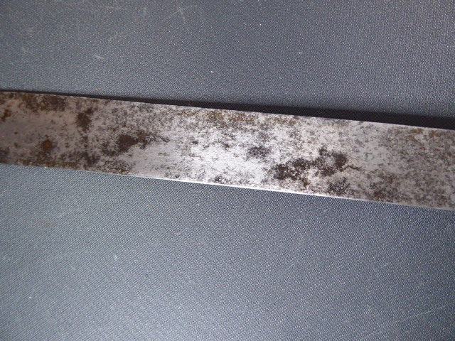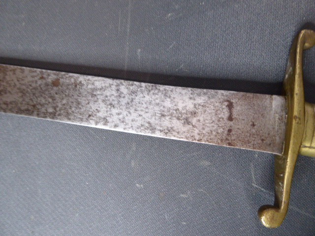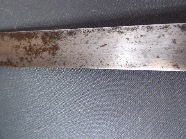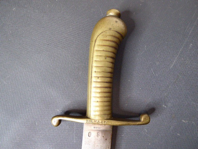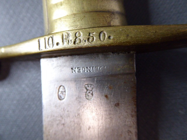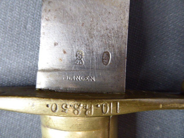 Aus meiner Sammlung gebe ich, ein altes großes mir Unbekanntes Faschinenmesser ohne Scheide Hersteller SOLINGEN viele Punzen ab. Kenner werden es sicherlich wissen wo das Teil hingehört. Gefäß mehrteilig aus Messing, Parierung mit Regiment Bezeichnung, 110. R. 8. 50. mit Originaler Angel Vernietung. Breite einschneidige längere Klinge, eine Seite mit Hersteller Solingen darunter zwei Punzen S unter Krone, andere Seite punze? unter Krone und von mir nicht definierbare Inschrift. Das Teil ist im Sammelwürdigen Zustand. Alles andere entnehmen Sie Bitte den Fotos. Gesamtlänge: 60,2 cm, Klingenlänge: 46,7 cm, Klingenbreite: 3,3 - 3,7 cm. Kann zu jederzeit bei mir besichtigt werden. Privatauktion keine Rücknahme und Garantie.