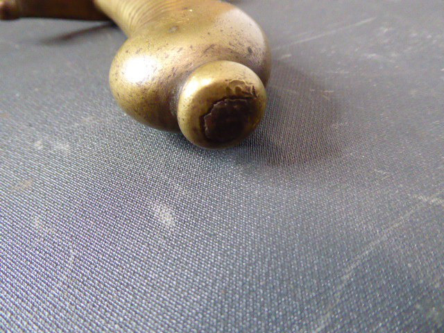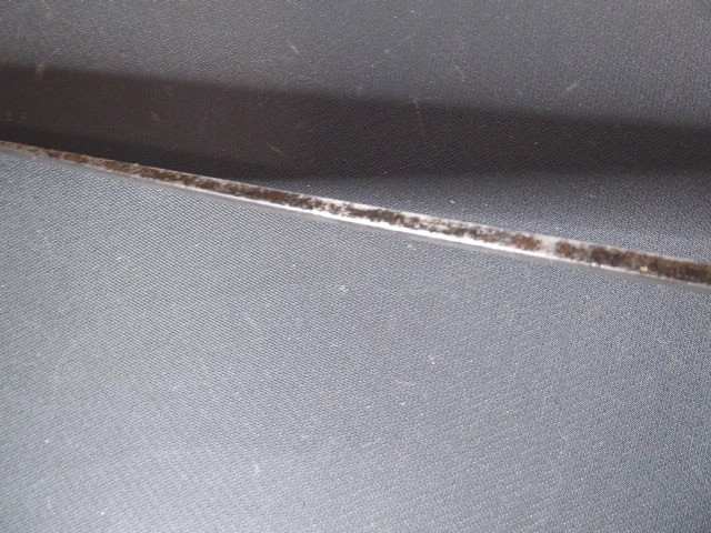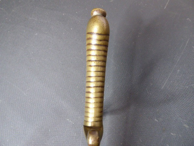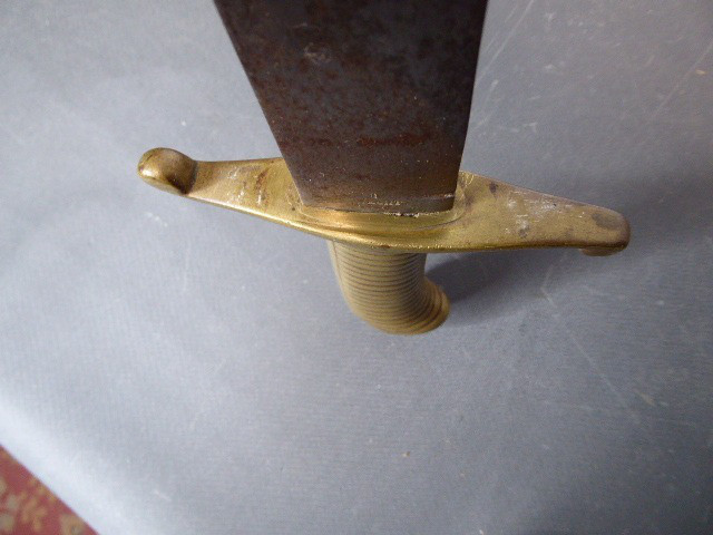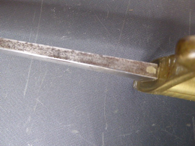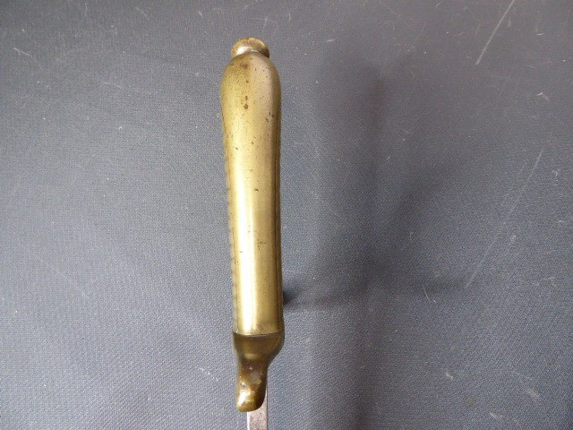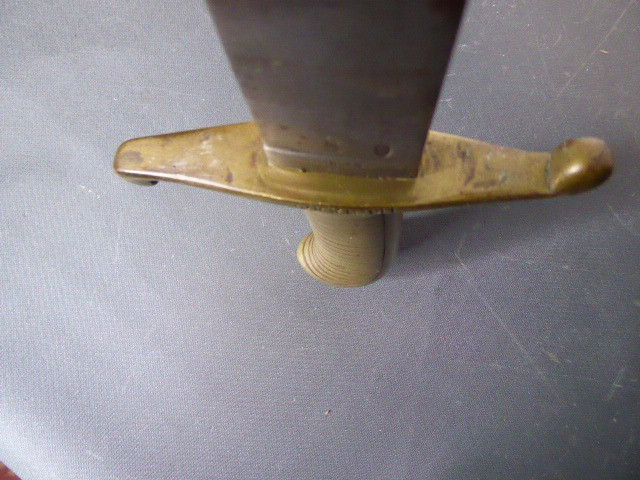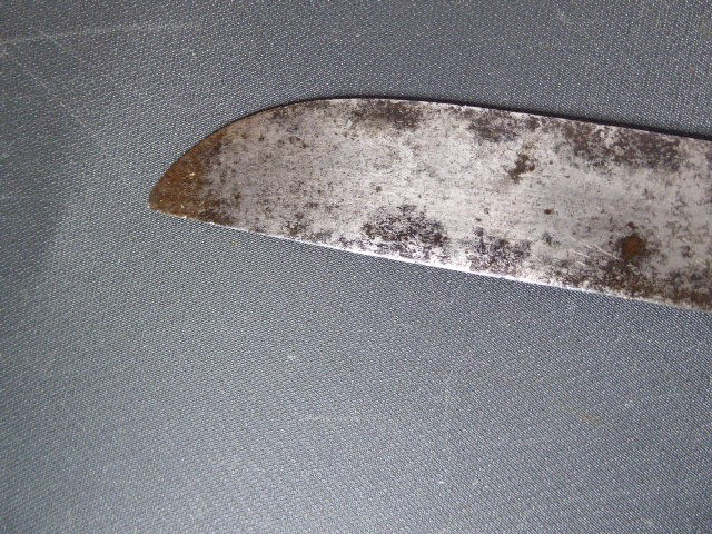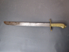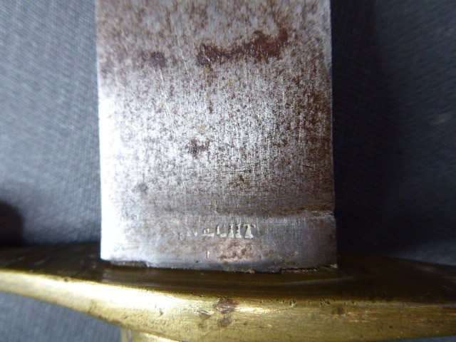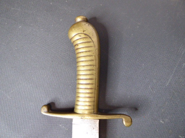 Aus meiner Sammlung gebe ich, ein altes großes mir Unbekanntes Faschinenmesser ohne Scheide Hersteller SOLINGEN viele Punzen ab. Kenner werden es sicherlich wissen wo das Teil hingehört. Gefäß mehrteilig aus Messing, Parierung mit Regiment Bezeichnung, 110. R. 8. 50. mit Originaler Angel Vernietung. Breite einschneidige längere Klinge, eine Seite mit Hersteller Solingen darunter zwei Punzen S unter Krone, andere Seite punze? unter Krone und von mir nicht definierbare Inschrift. Das Teil ist im Sammelwürdigen Zustand. Alles andere entnehmen Sie Bitte den Fotos. Gesamtlänge: 60,2 cm, Klingenlänge: 46,7 cm, Klingenbreite: 3,3 - 3,7 cm. Kann zu jederzeit bei mir besichtigt werden. Privatauktion keine Rücknahme und Garantie.