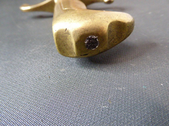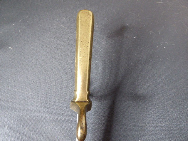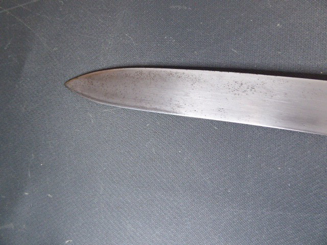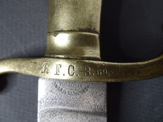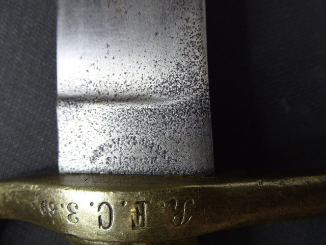Aus meiner Sammlung gebe ich, ein altes Preußisches UM Faschinenmesser ohne Scheide, mit Hersteller Regimentbezeich. ab. Kenner werden es sicherlich wissen wo das Teil hingehört. Gefäß mehrteilig aus Messing, Parierung gestempelt, Regiment Bezeichnung R. F. C. 3. 69. Breite einschneidige Klinge, auf eine Seite Hersteller? den kann ich aber nicht entziffern, andere Seite O 1868 gestempelt. Das Teil ist im Sammelwürdigen Zustand. Alles andere entnehmen Sie Bitte den Fotos. Gesamtlänge: 56,3 cm, Klingenlänge: 43,5 cm, Klingenbreite: 3,5 cm. Kann zu jederzeit bei mir besichtigt werden. Privatauktion keine Rücknahme und Garantie.