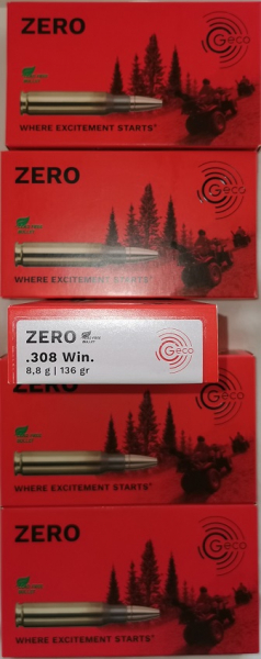 Geco Munition; Kaliber .308 Winchester; Geschossgewicht 8,8 Gramm; Geschosstyp Zero; Anzahl fünf Packungen = 100 Schuss; Die Munition ist nummergleich und ungeöffnet. Bild vorhanden.