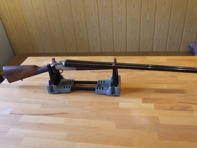 Doppelflinte von Zimmermann mit langen Platten und einem Englischem Schaft im 12/70 . Länge 113cm , Lauflänge 720cm , Abstand zum Abzug 36cm mit Ejektor.