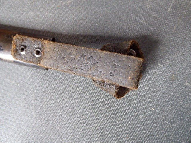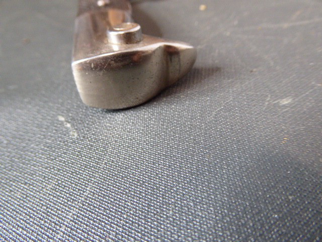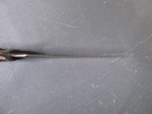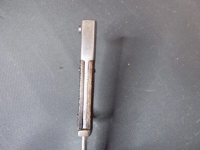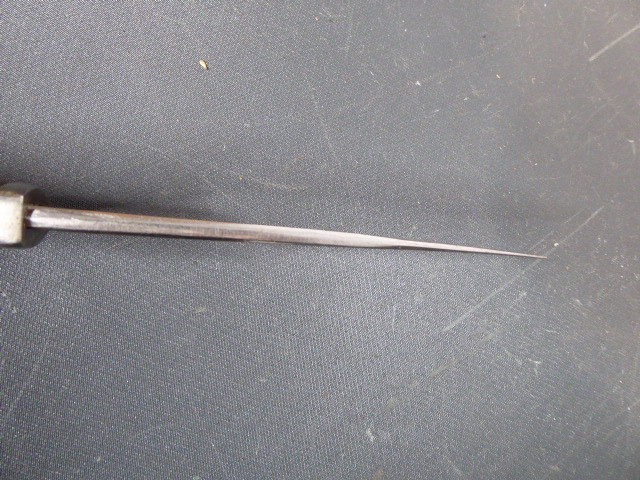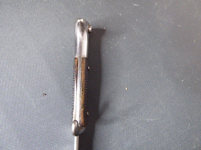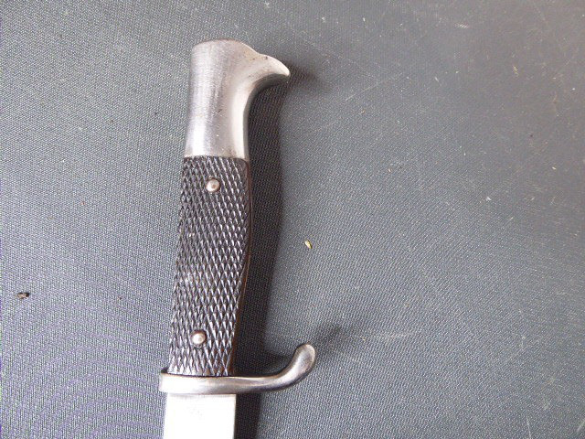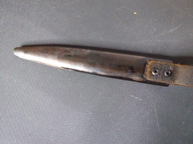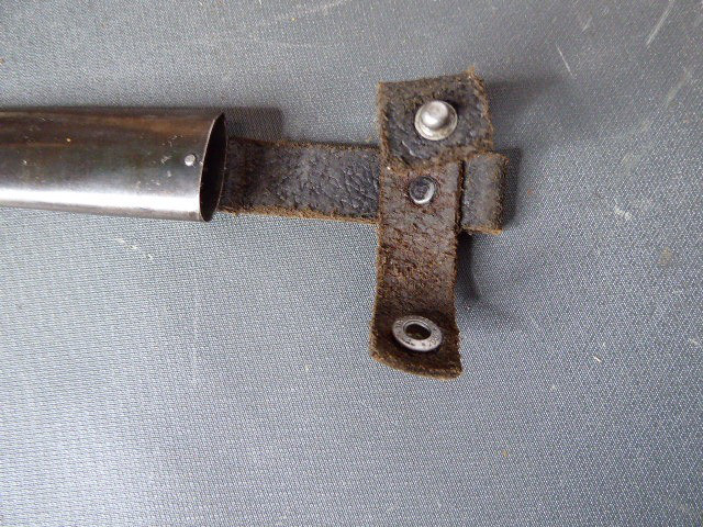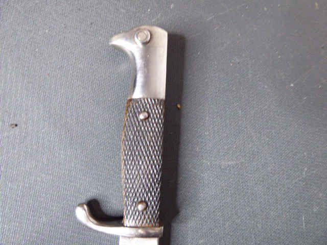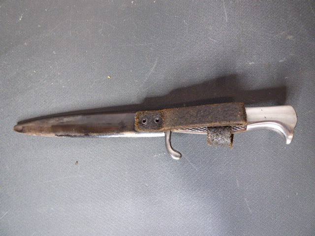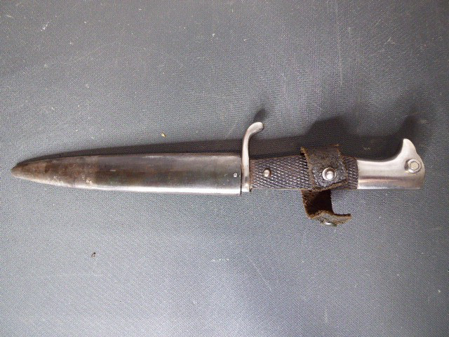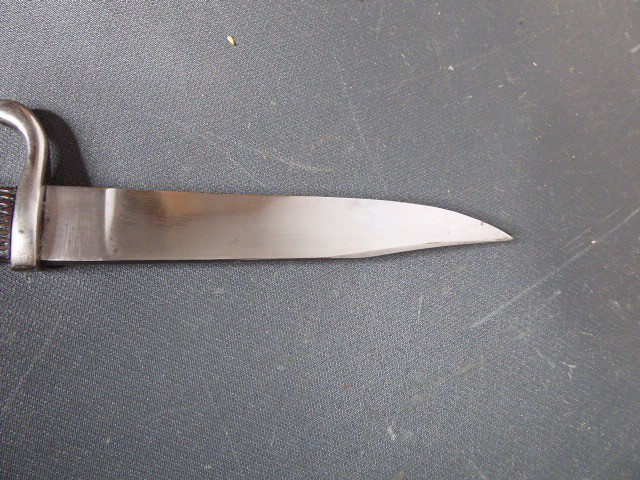 Aus meiner Sammlung gebe ich, einen altes Offizier Seitengewehr 1 WK später als Grabendolch geführt mit Scheide ohne Hersteller ab. Kenner werden es sicherlich wissen was das Teil ist. Griff zwei schwarze Holzschalen. Gefäß Eisen Knauf als Stilisierten Vogelkopf nicht Aufpflanzbar.. Einschneidige Klinge in leichter Bowie Vorm. Stahlscheide mit Leder Gehänge. Alles andere entnehmen Sie Bitte den Fotos. Gesamtlänge: 27,3 cm, ohne Scheide: 26,5 cm, Klingenlänge: 15,3 cm, Klingenbreite: 2,2 cm. Kann zu jederzeit bei mir besichtigt werden. Privatauktion keine Rücknahme und Garantie.
