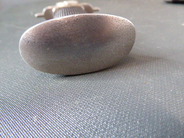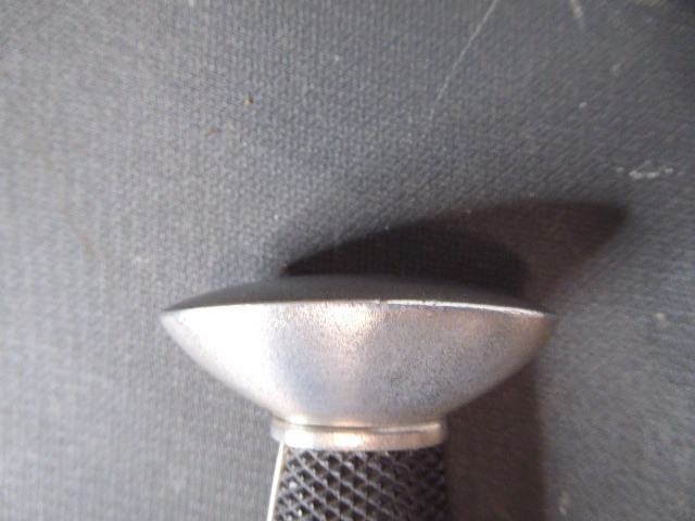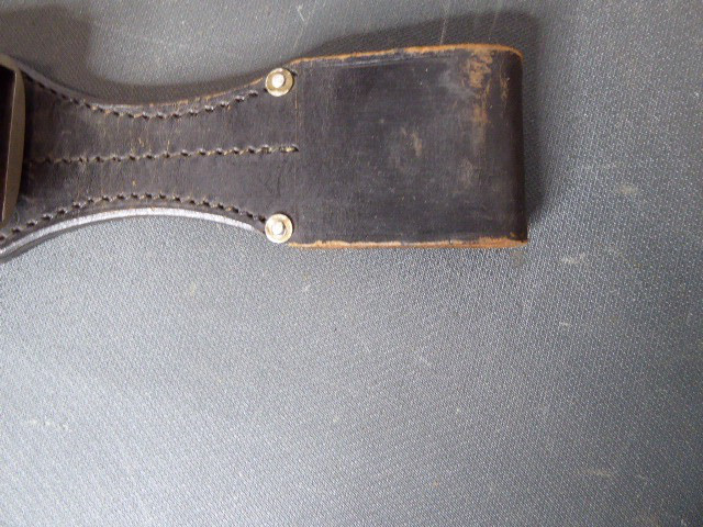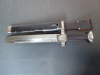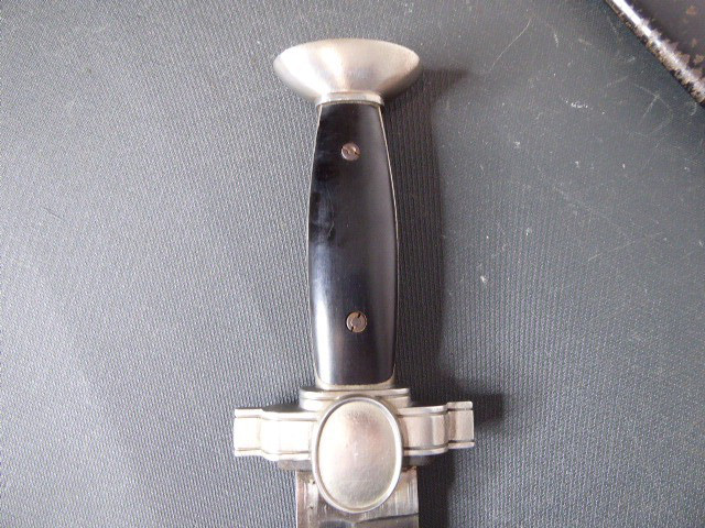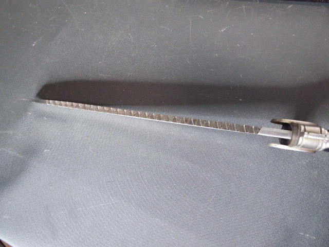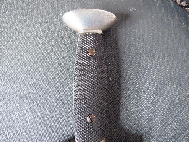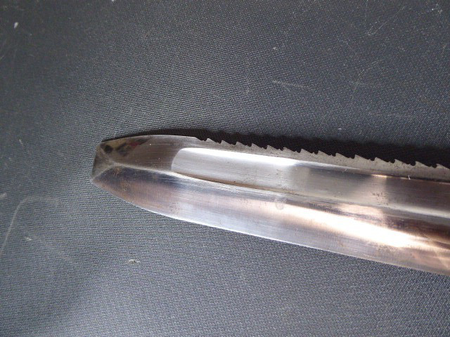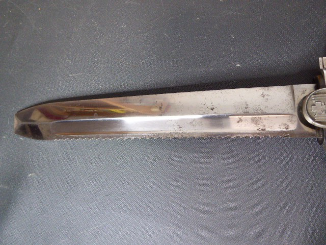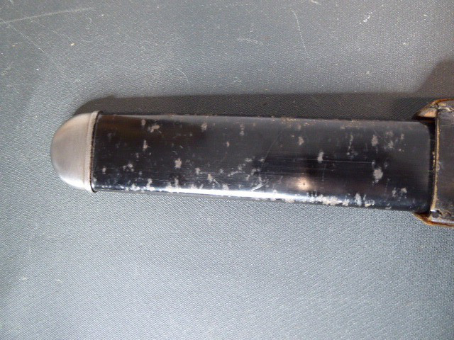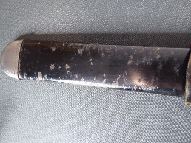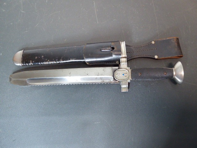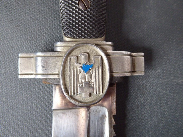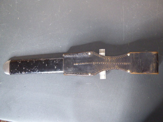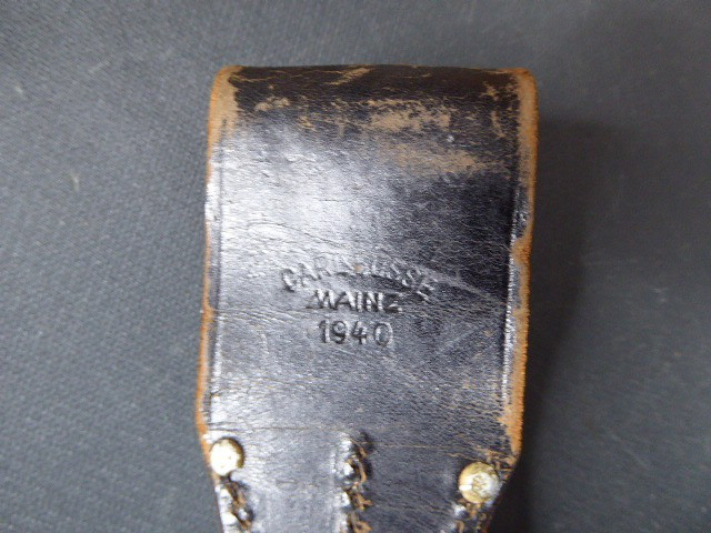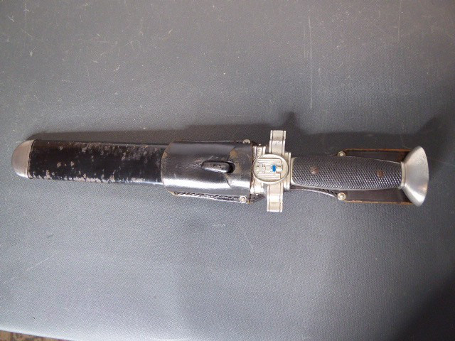 Aus meiner Sammlung gebe ich, einen altes Sanitäter Seitengewehr 2.WK mit Scheide Trageschuh Hersteller GES. Geschützt ab. Kenner werden es sicherlich wissen was das Teil ist. Griff zwei schwarze Bakelit Schalen. Gefäß schwere Ausführung, alles Gut erhalten. Einschneidige Klinge mit Sägerücken, vorne keine Spitze nur Flach, einseitig Hersteller Gesetzlich Geschützt. Stahlscheide zu 90% noch mit Original Lack. Originaler Trageschuh auch gestempelt KARL BUSSE MAINZ 1940. Alles andere entnehmen Sie Bitte den Fotos. Gesamtlänge: 41,5 cm, ohne Scheide: 39,7 cm, Klingenlänge: 26,8 cm, Klingenbreite: 3,8 cm. Kann zu jederzeit bei mir besichtigt werden. Privatauktion keine Rücknahme und Garantie.