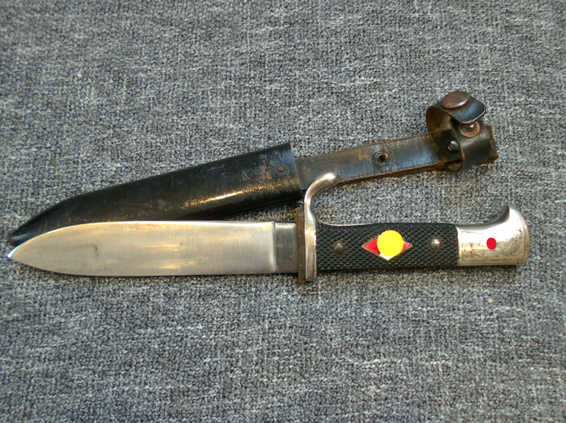 HJ Fahrtenmesser mit verziertem Kopf beidseitig mit HK und floralem Muster. Hersteller E F Hörster.
