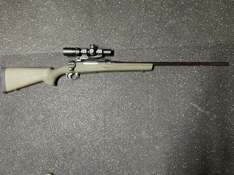 Zum Verkauf kommt eine umgebaute Mauser 98, im Kaliber 8x68S, mit 65 cm Lauf und Beschuss 2025. Die Waffe hat einen Timney Abzug und eine gedämpfte Schaftkappe.