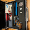 Die Luftpistole ist in einem guten Zustand. Lediglich am Lauf befindet sich leichter Beschlag. Die Kartusche ist gültig bis 2026. Die Schussleistung der Luftpistole ist einwandfrei Bestleistung 361 Ringe. Die Luftpistole wurde seinerzeit bei der Firma Holme in diesem Alu Koffer gekauft. Montiert ist ein Griff der Firma Rink,größe M in Rechts-Ausführung. Dieser Griff ist weder geschliffen noch sonst wie bearbeitet neuwertig.