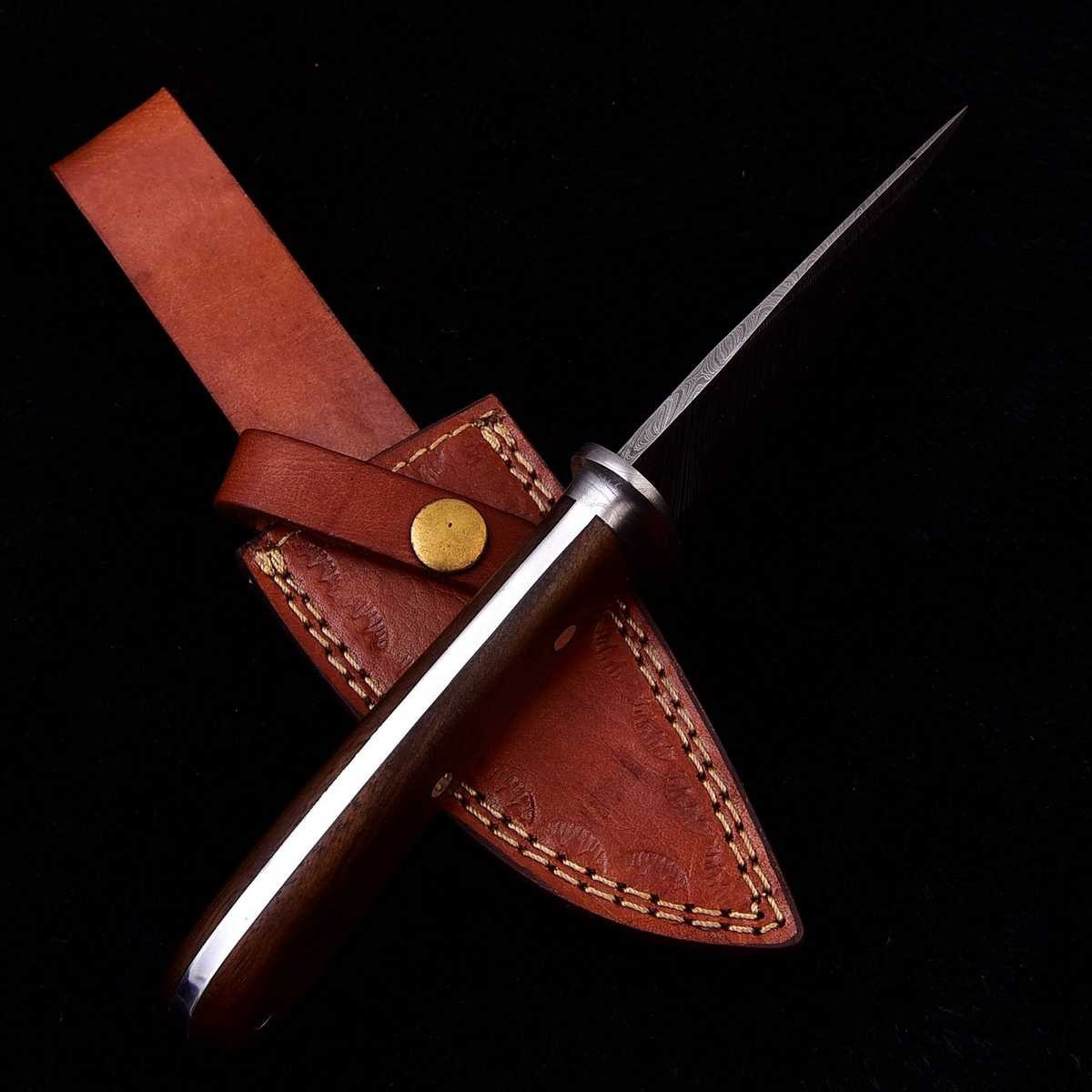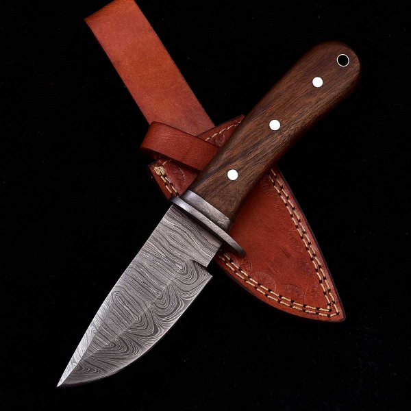 Das Damaszener-Stahl Jagdmesser wird mit einer hochwertigen Lederscheide aus echtem Rindleder geliefert, die das Messer sicher aufbewahrt und einen bequemen Transport ermöglicht. Die Lederscheide ist strapazierfähig, langlebig und verleiht dem Messer einen Hauch von rustikaler Eleganz.