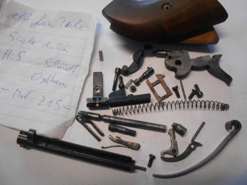 Alle gut erhaltenen freien Teile für SA Revolver Mod.21 S von Schmidt aus Ostheim im Kal.22lr., originaler Zustand mit normalen leichten Gebrauchsspuren. Siehe Foto. Alles darauf(außer der Pappschachtel) wird geliefert, Holzteile alle gut. Nach dem Kauf bekommen sie über Egun automatisch einen Email mit den Kontodaten für die Überweisung. Wer mehr Bilder benötigt oder Rückfragen hat bitte melden. Danke im voraus.