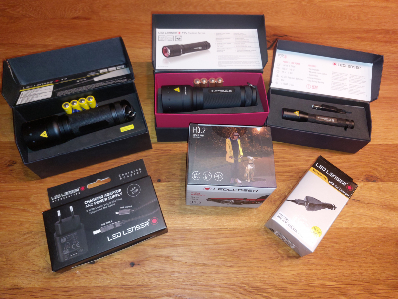 6 teiliges Taschenlampenset LED Lense, bestehend aus: P3R, T7.2, T7, Kopflampe H3.2 ,USB Autoadapter & USB A auf Micro B charging Adapter
