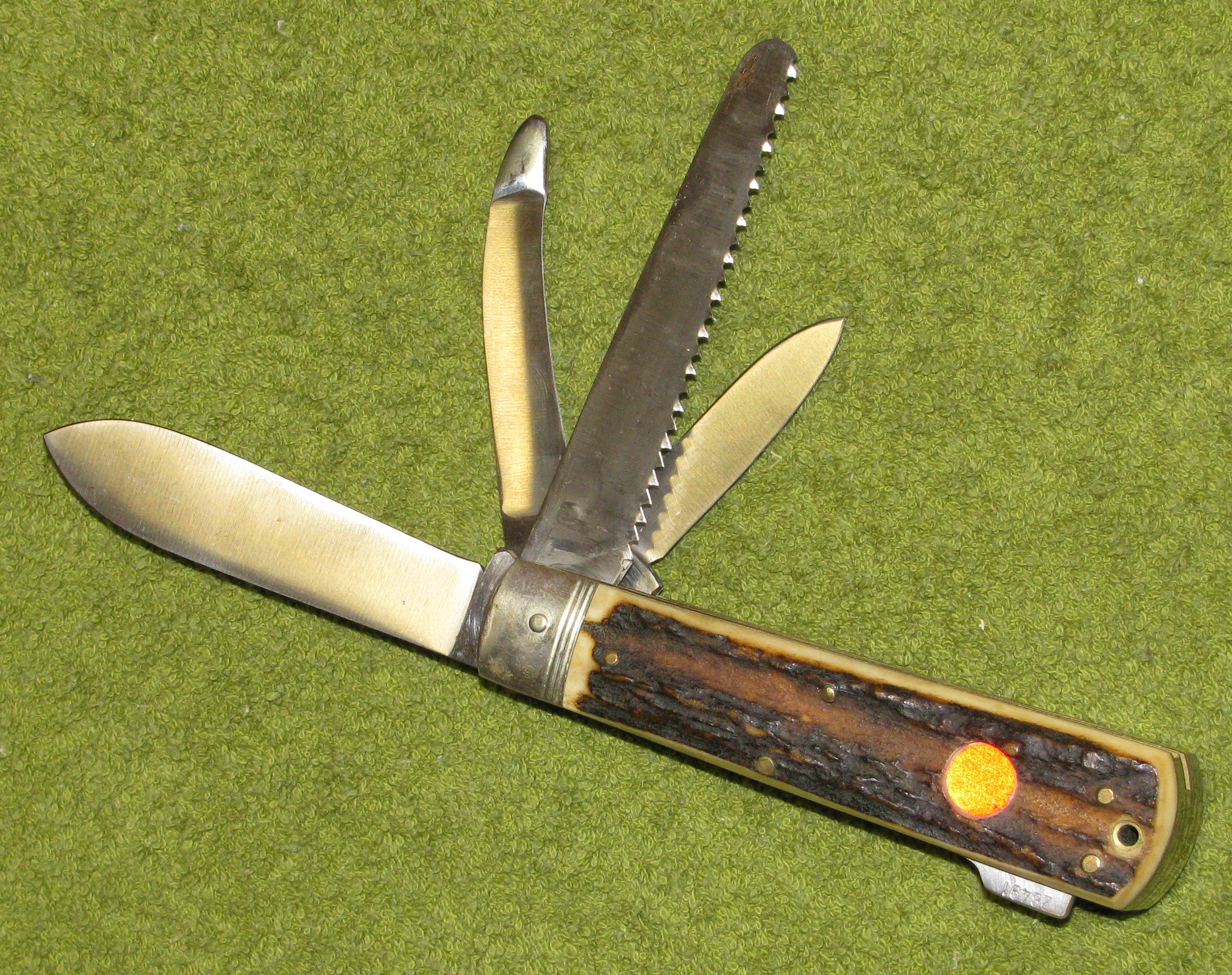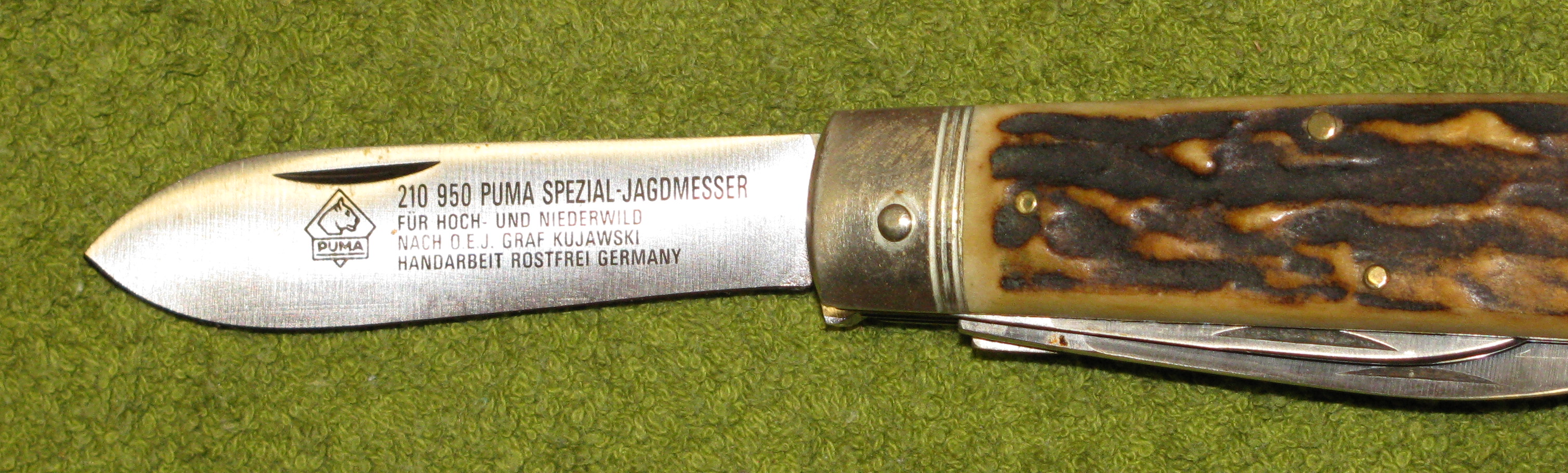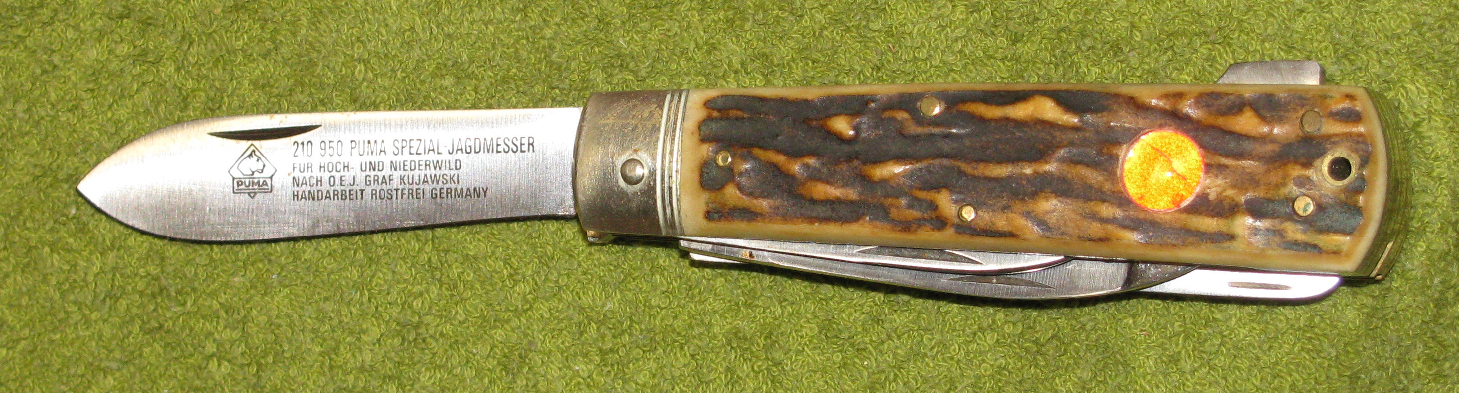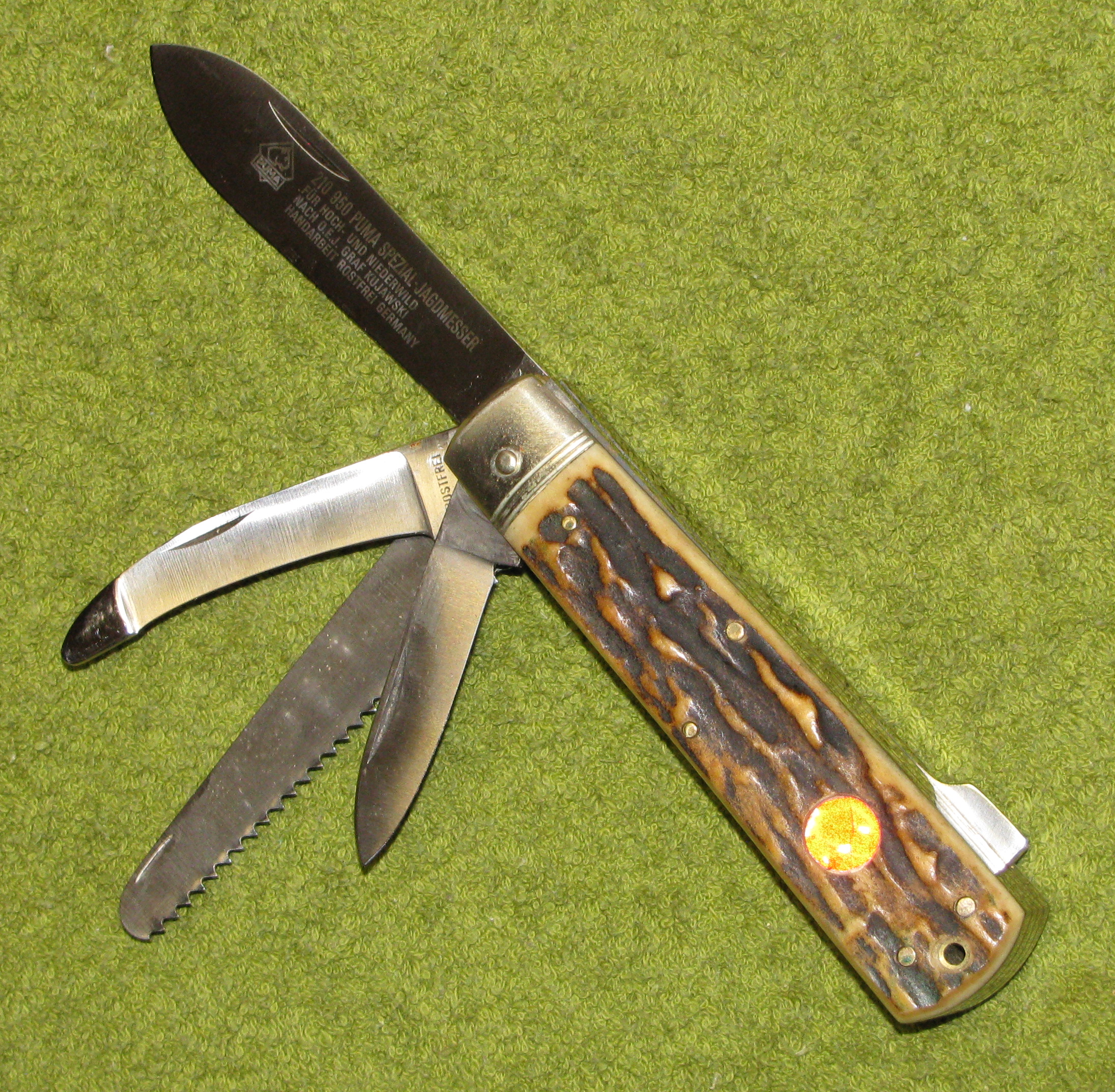 Zum Verkauf kommt ein unbenutztes PUMA Taschenmesser mit Horn und Lederscheide