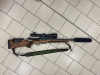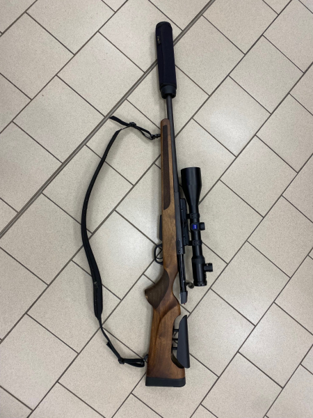 Repetierbüchse Brenner BR 20 im Kaliber .308 Win mit werkzeuglos verstellbarem Schaftrücken, Dreistellungssicherung und Schalldämpfer Stalon X-Series im Kal. .30. Lauflänge 47 cm, Schaftlänge 36,5 cm und die Gesamtlänge beträgt 100 cm ohne und 110 cm mit montiertem SD. Optik ist ein Zeiss Varipoint V 3-12x56 T, Absehen 56 ohne Schiene, mit Dentler Basis Montage. Die Waffe hat normale Gebrauchsspuren und ist technich in einwandfreiem Zustand.