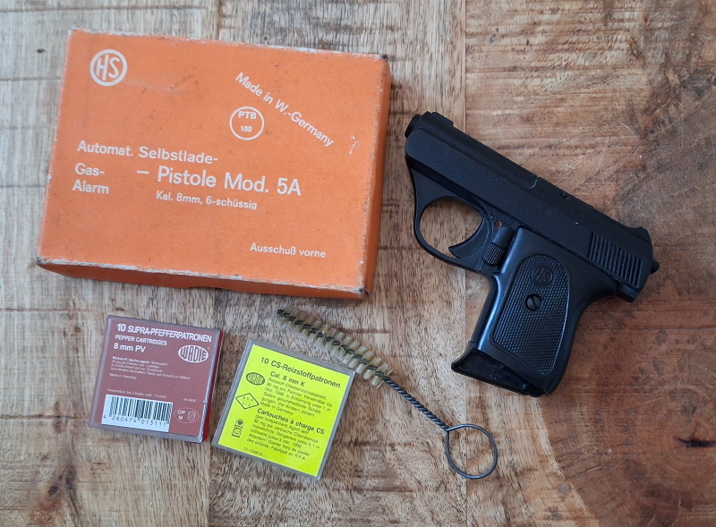 Sie bieten auf eine gebrauchte gut erhaltene Schreckschusspistole von HS Modell 5 A. Made in Germany Ostheim/Rhein! Mit OVP, Magazin, Reinigungsbürste und abgelaufenen Reizstoffpatronen! Privatauktion!Ohne Rücknahmepreis und Gewähr!